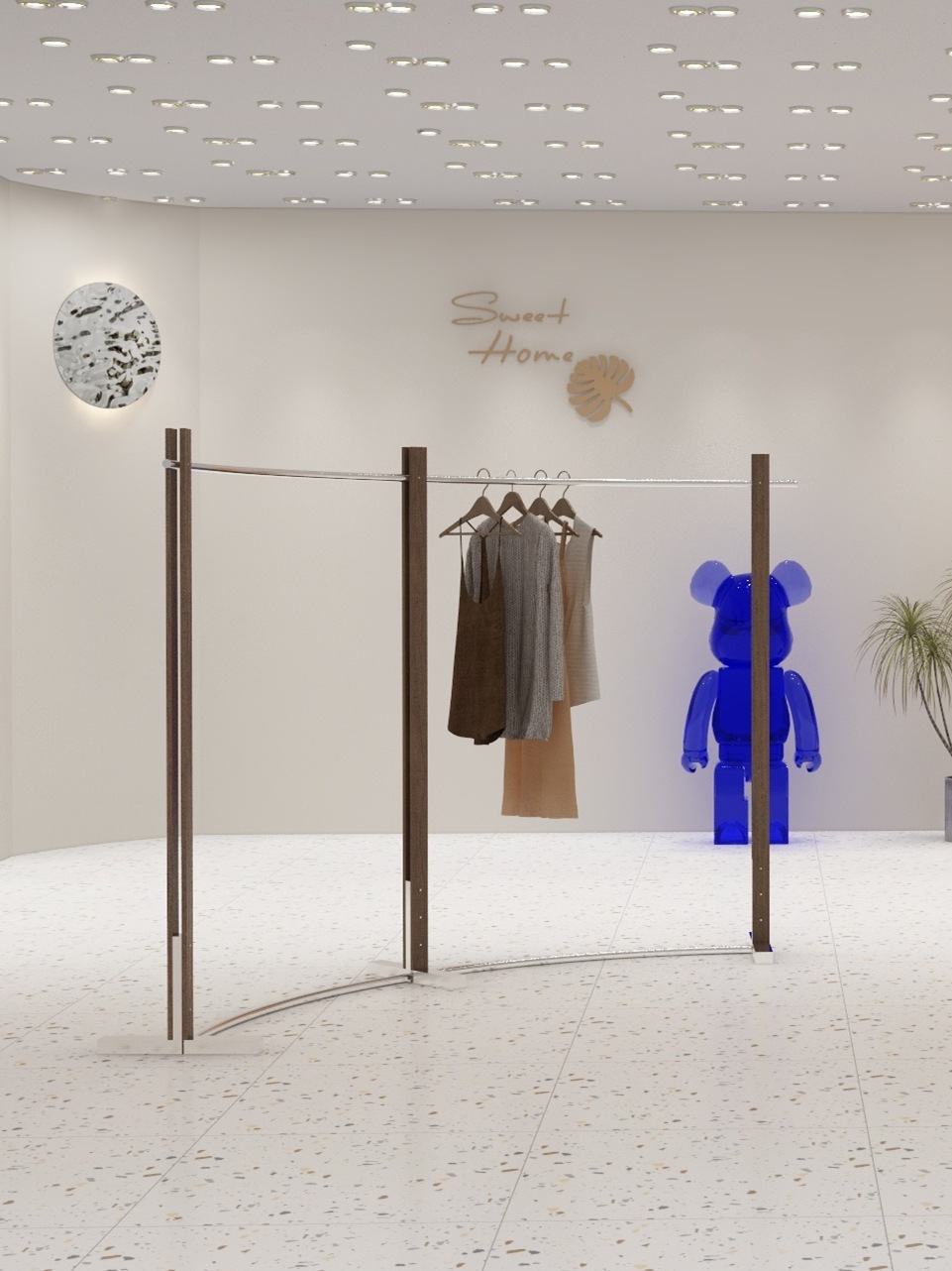 洋服店ステンレスと木目色の上壁展示棚陳列棚男性婦人服店床置き式ハンガー