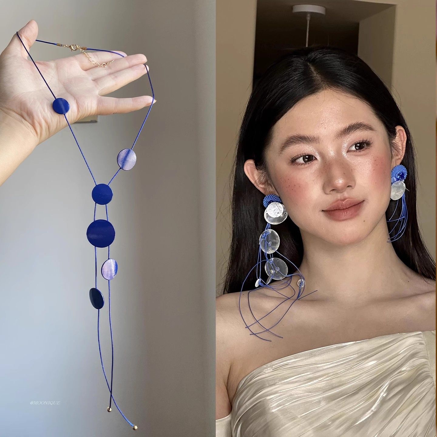 蓝调时刻~超显白克莱因蓝色不规则圆片长项链度假风小众设计颈链
