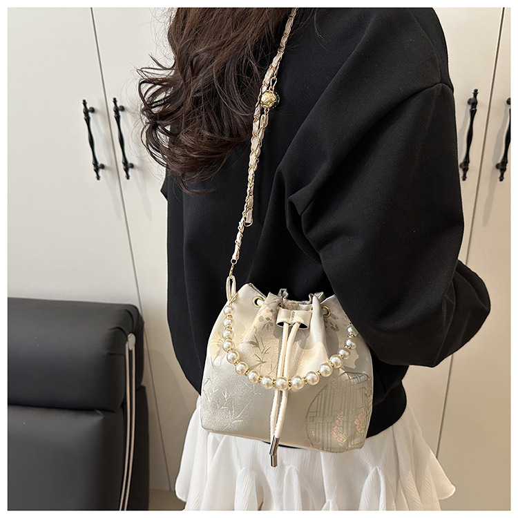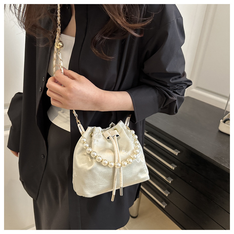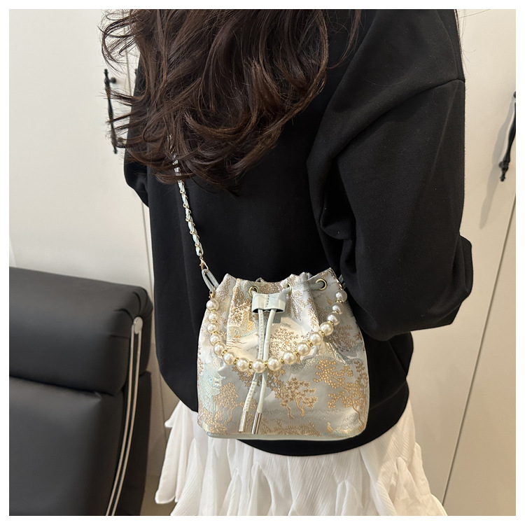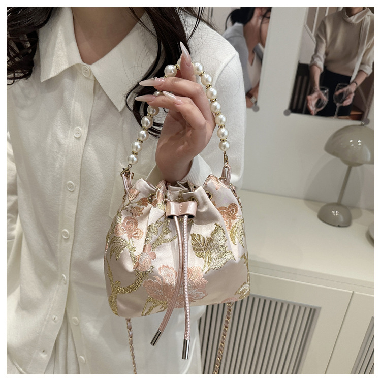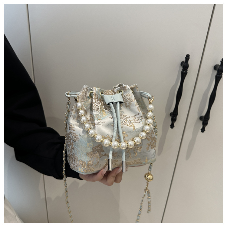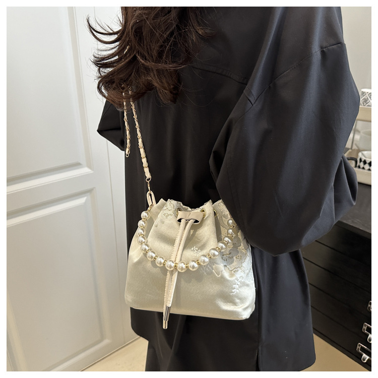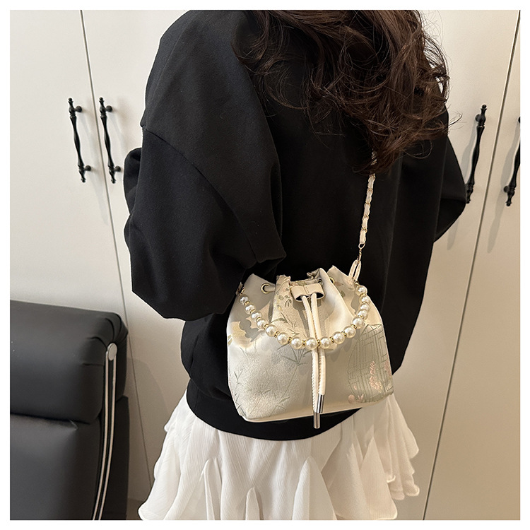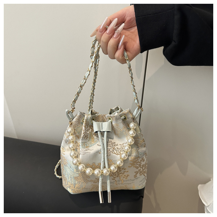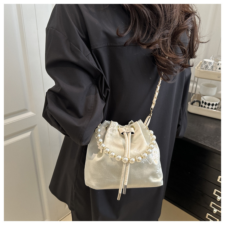 真珠チェーンのバケツを持って女性2025夏の新中国式刺繍シングルバッグ