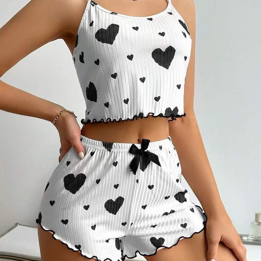 新しいクロスボーダーレディースホームウェアニットアンチストリップラブプリントサスペンダーショーツカジュアルウェアラブルパジャマセット