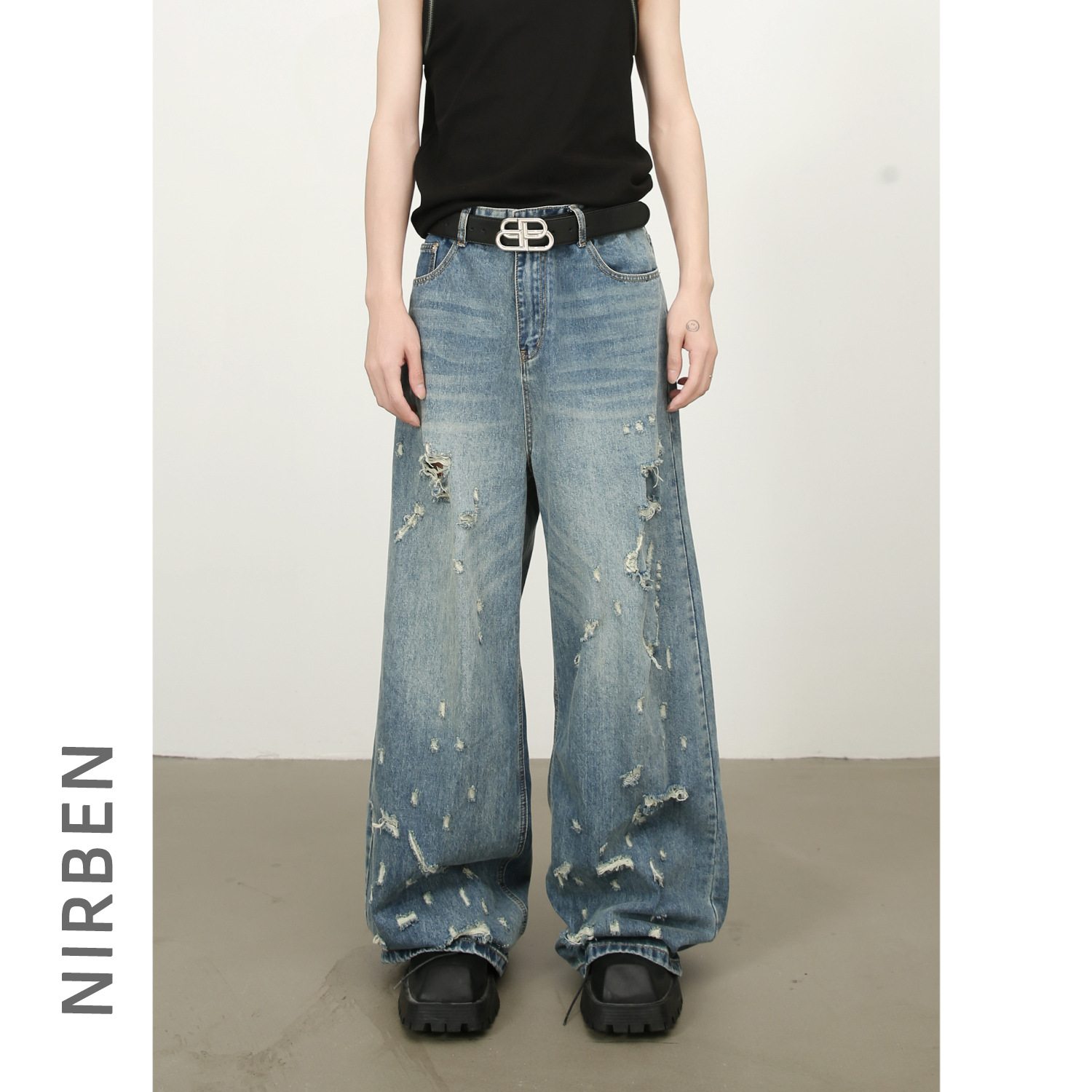 nirben牛仔|复古破洞弯刀牛仔裤男宽松美式半松紧腰高街潮牌长裤