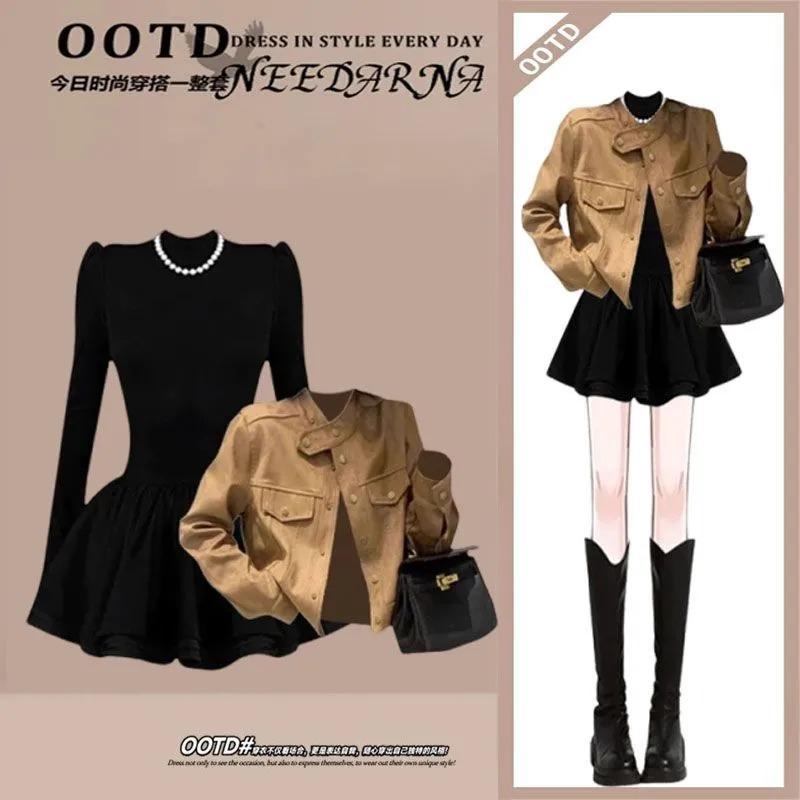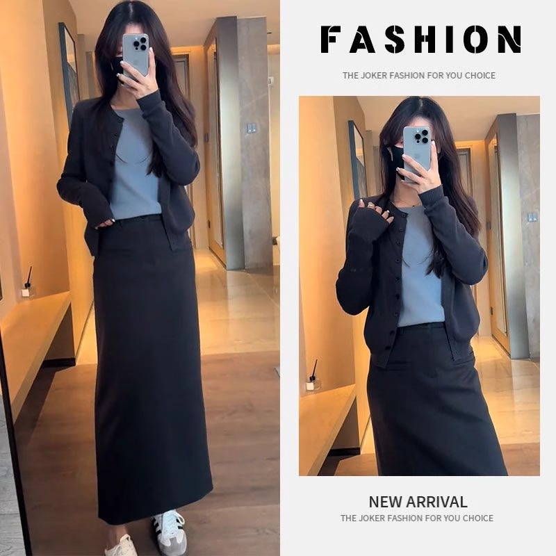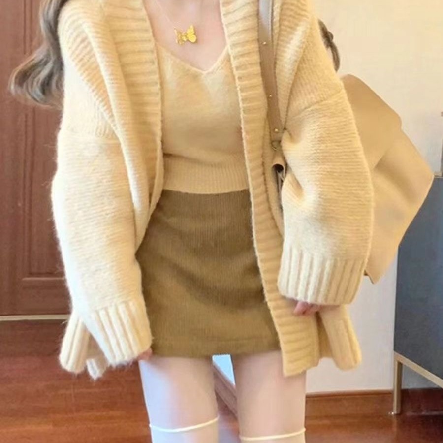韓国ドラマスカートスーツ、小柄な女性向け、レイジースタイルセーター、初春カーディガン一式、ストリートスタイル、ツーピースウェア