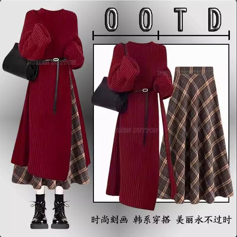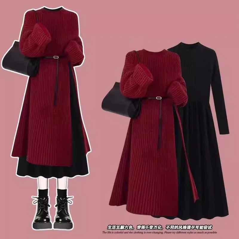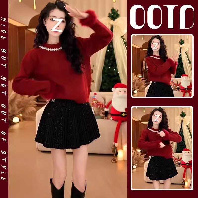 春の婦人服2025クリスマスは新型の気質の韓国系ニットのセーターを着て痩せて見えるワンピースの三点セットを着ます。