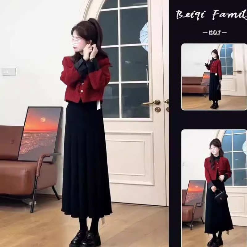 春秋高级感减龄穿搭女新款小众红色新中式针织毛衣半身裙两件套装