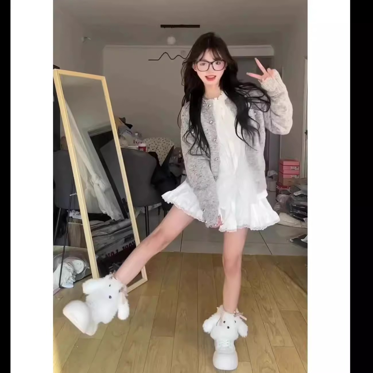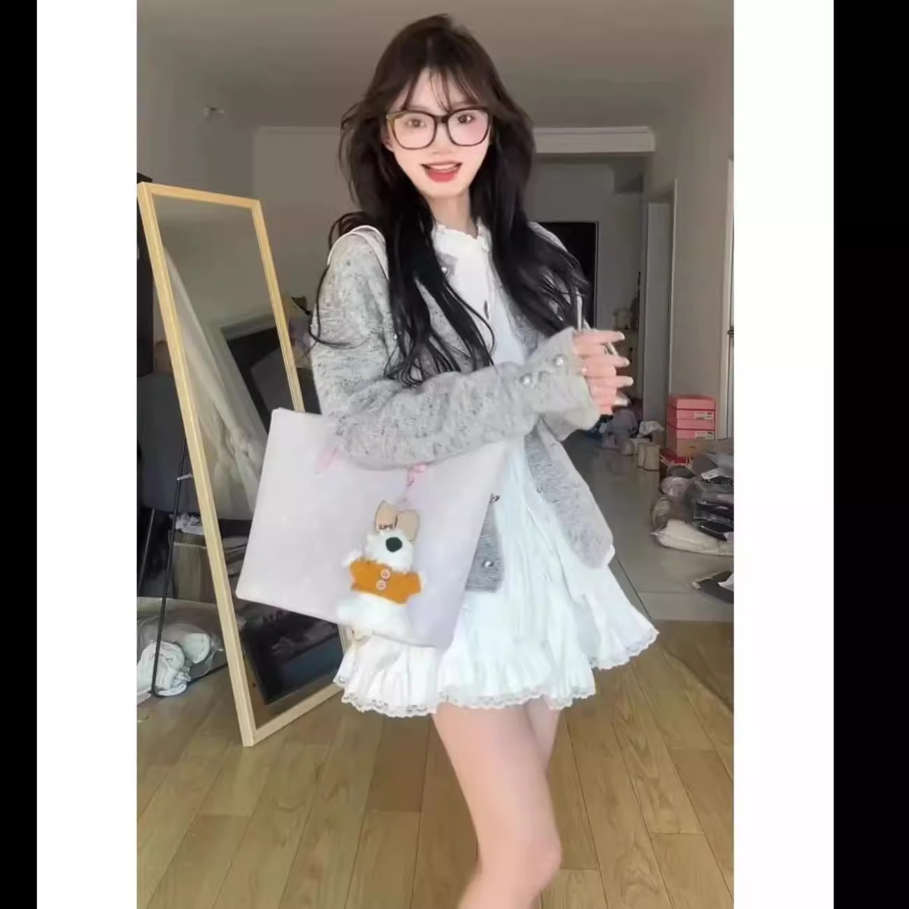 春の2025年の新型女性韓系高級感カーディガンの中に純欲コートのスカートを三点セット着ています。