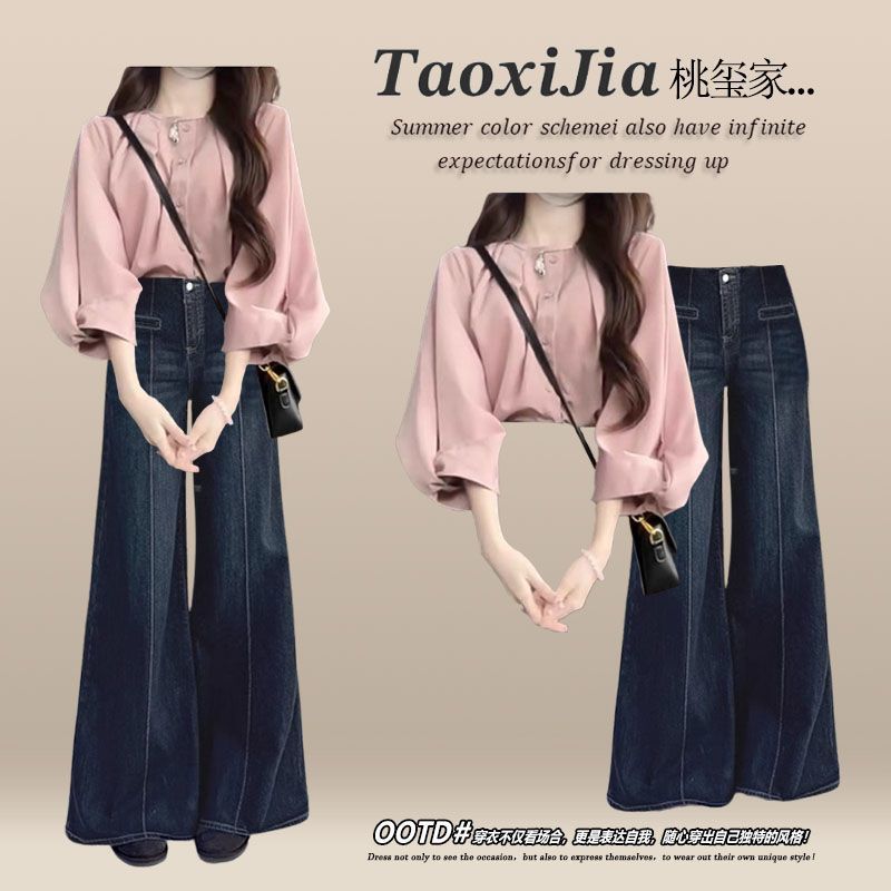 早秋氛围感穿搭套装女甜美温柔风超好看粉色衬衫牛仔阔腿裤两件套