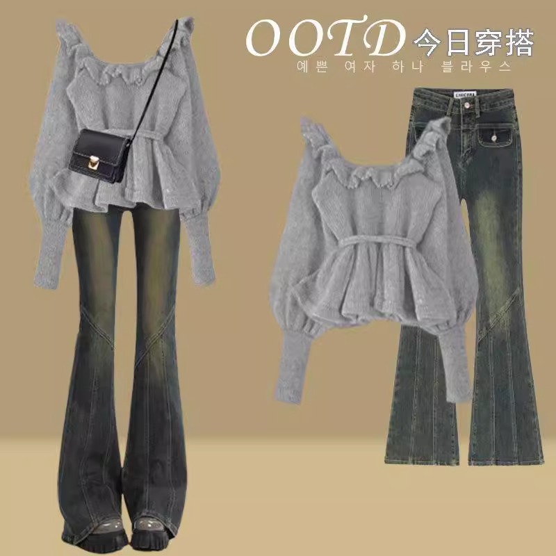 セット2025新型女装春太ったmm気質が痩せているニットセーターハイウエストジーンズ2点セットが流行している