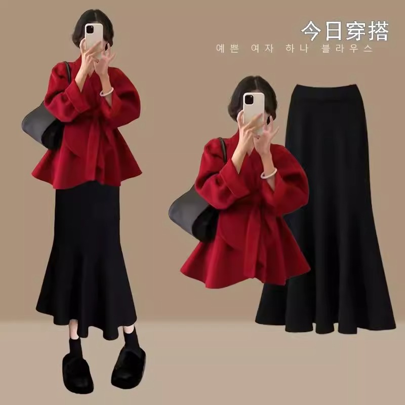 今年流行している女性2025春の新型アンコラ紅気質ウエストコートの魚尾スカートセット