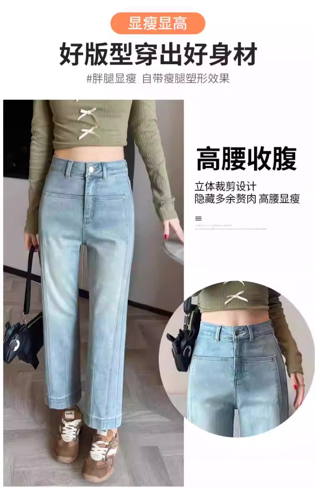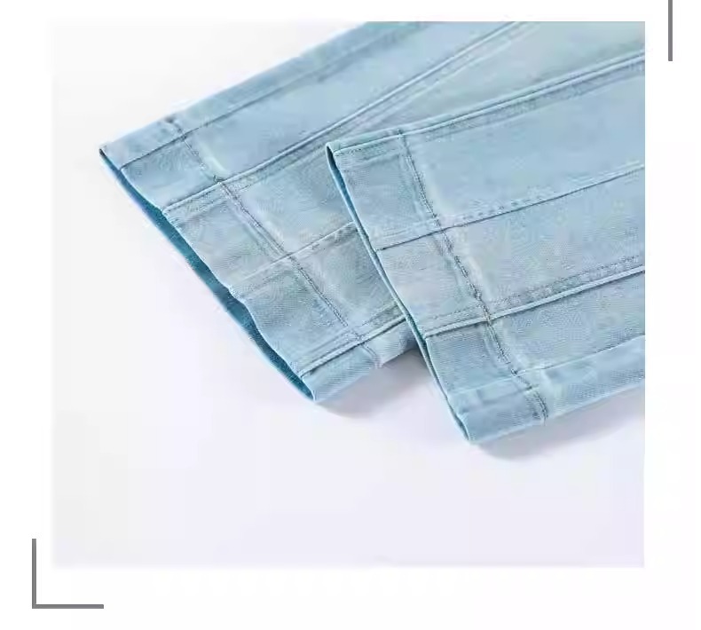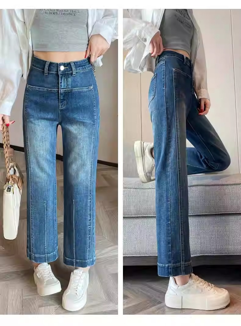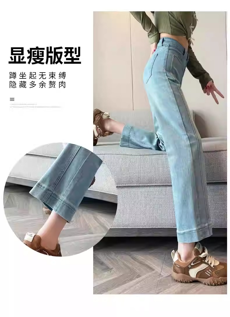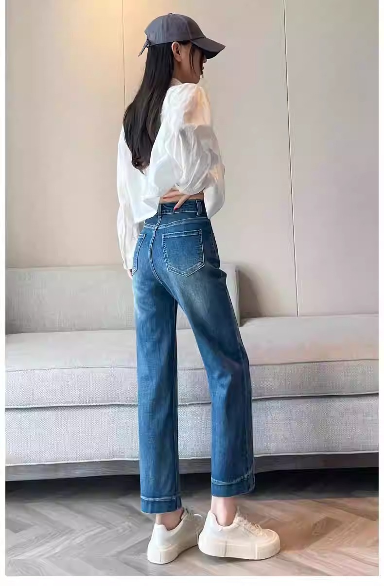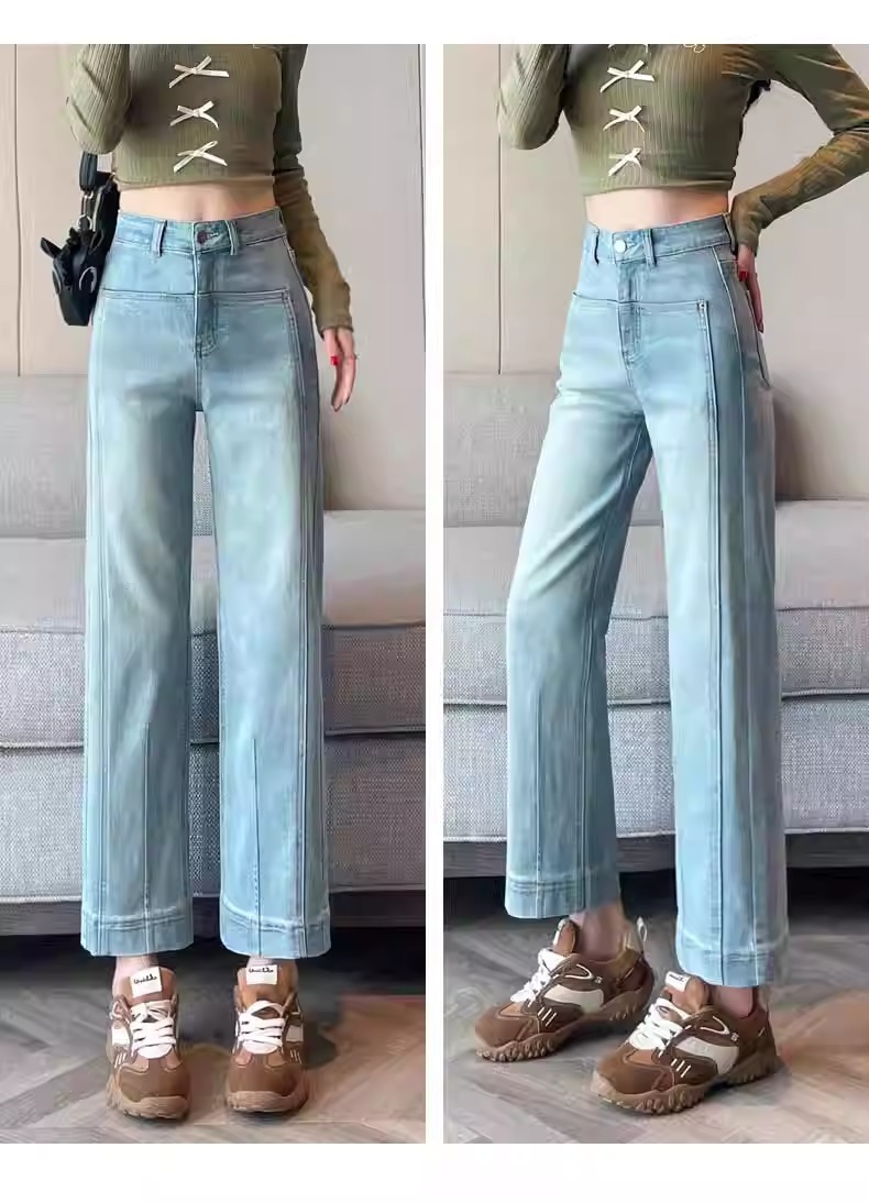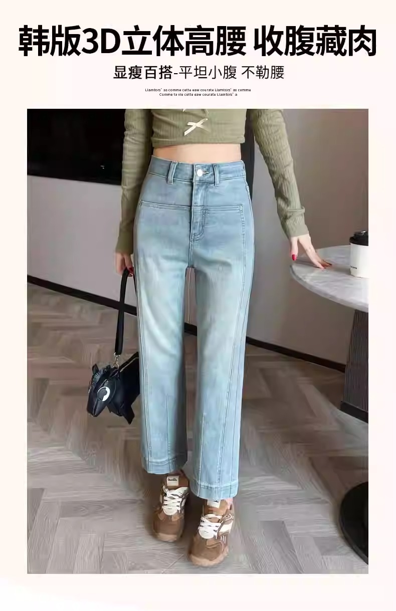 水色の狭い版のタバコの管のジーパンの女性の2025春の新型の高い腰の小さい背の弾力の法の棒のストレートなズボン