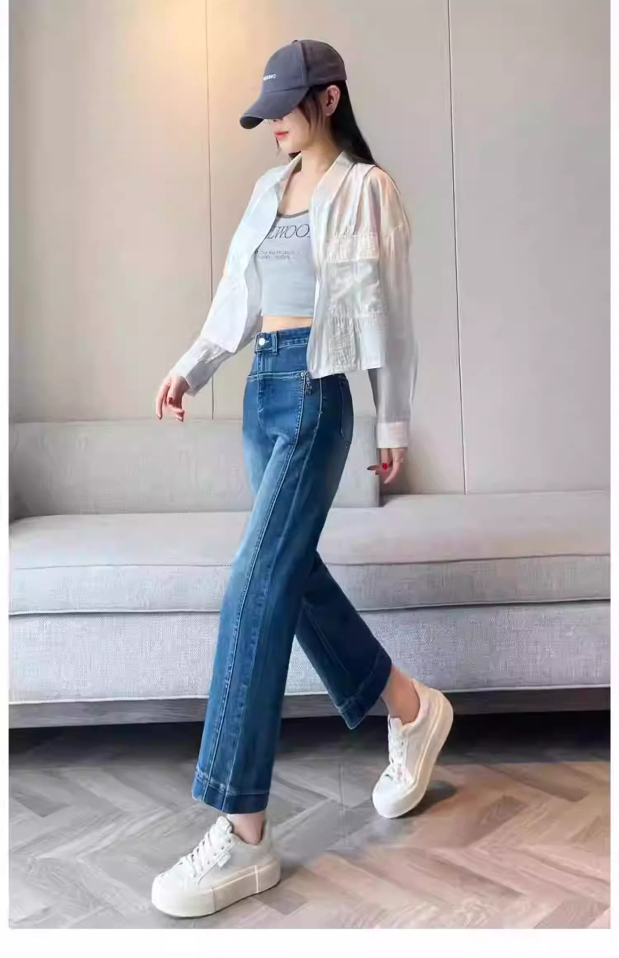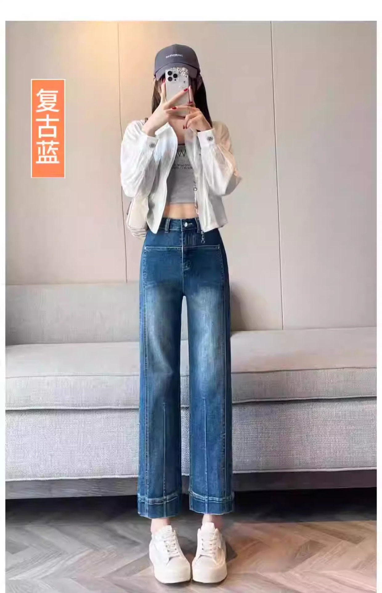 白いジーパンの女性のストレートな筒の2025年の春と秋のベルベットの新型の米の白い小柄なデザイン感の狭い版のワイドパンツ