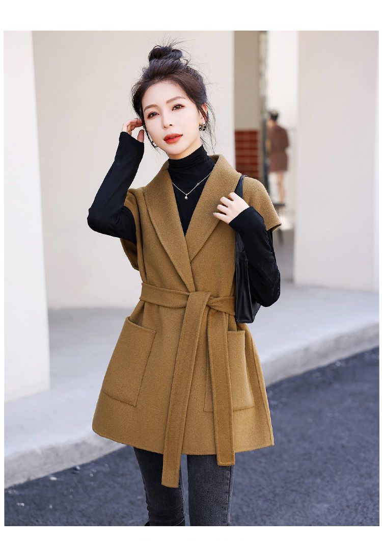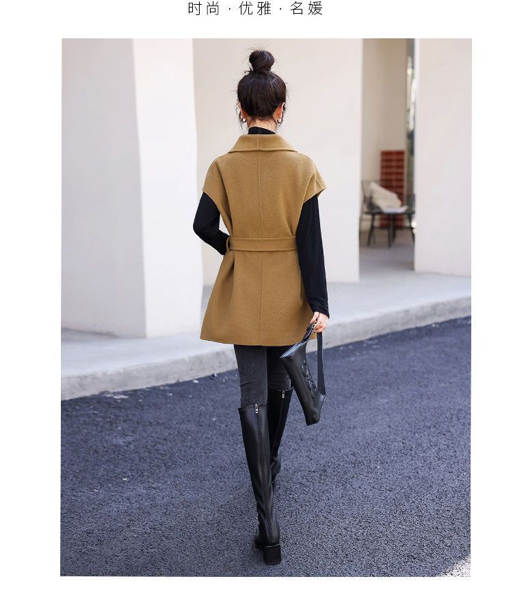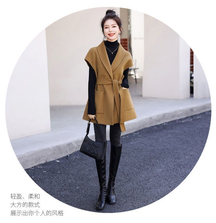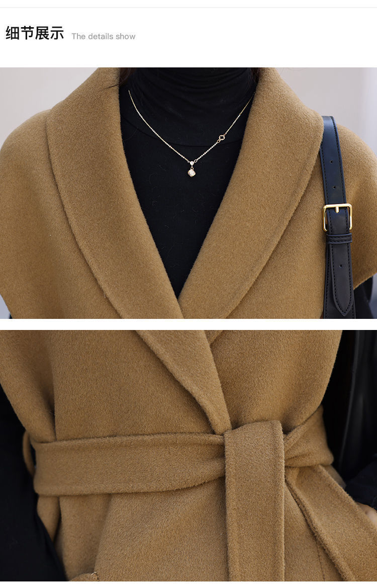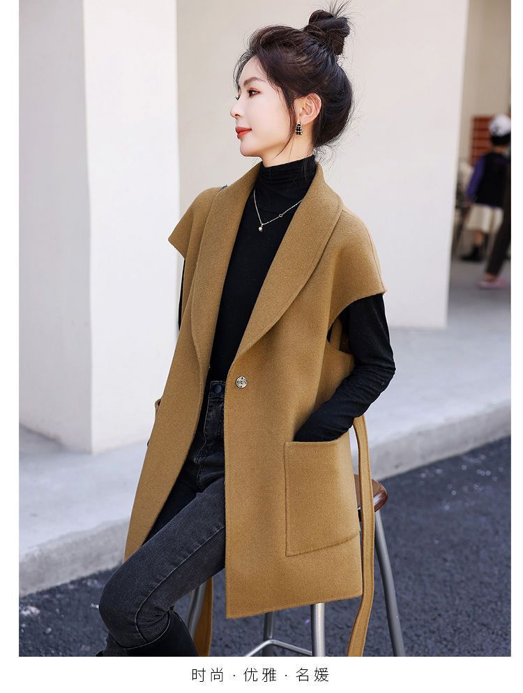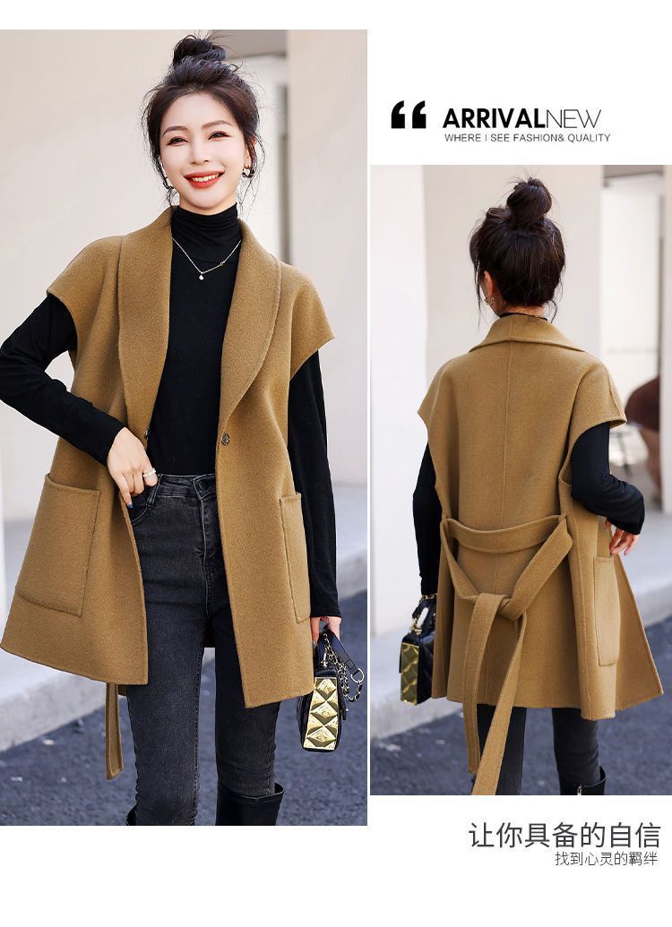 2023秋冬の新型毛は馬甲の女性の中の長いvネックの袖なしの肩のベストのベルトのラシャの馬のジャケットです。
