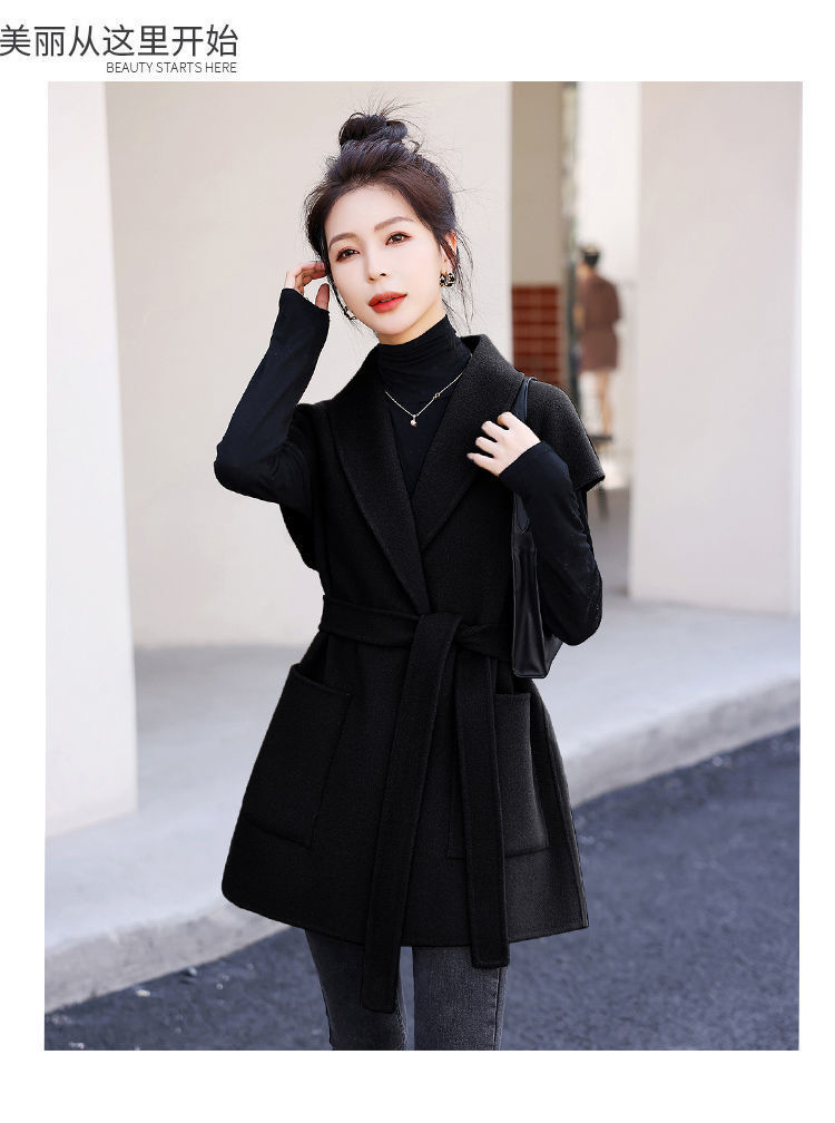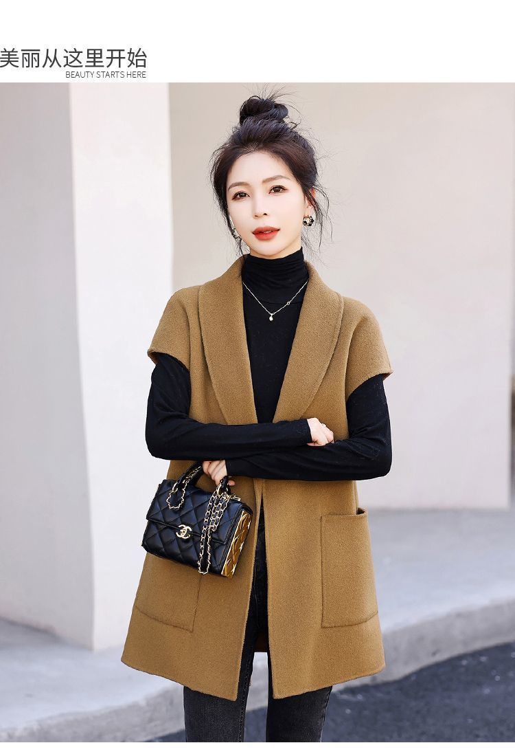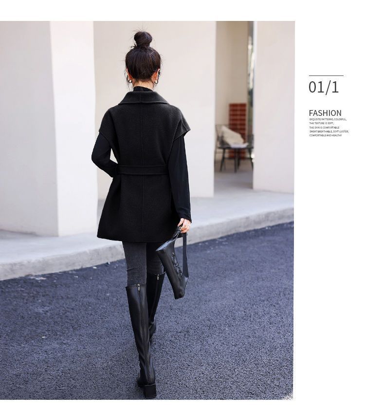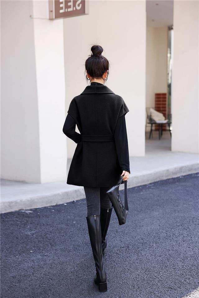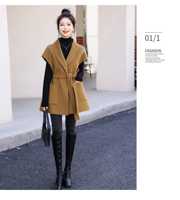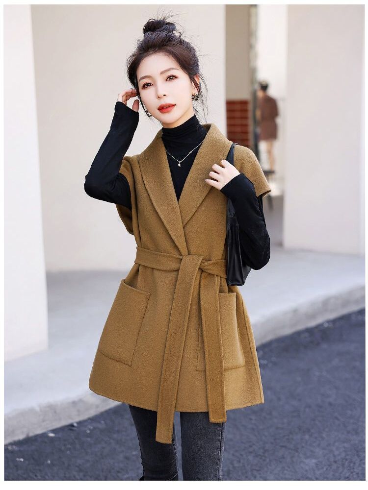 2023秋冬の新型毛は馬甲の女性の中の長いvネックの袖なしの肩のベストのベルトのラシャの馬のジャケットです。