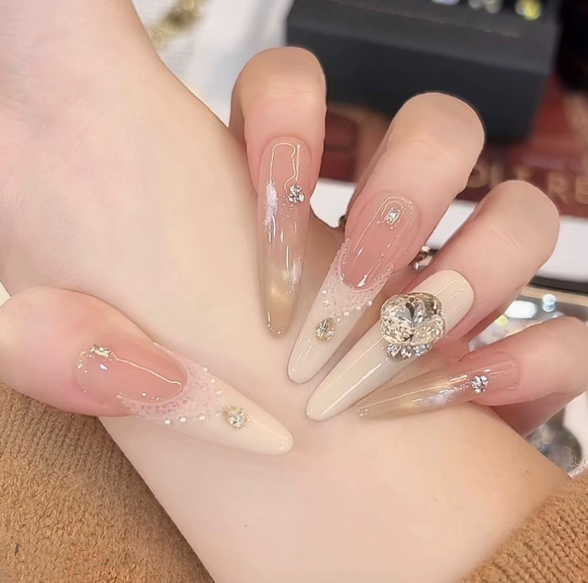 [Luo Yan] 純粋な手作りのウェアラブルネイル、ハイエンドのヌードブラッシュ、東州ダイヤモンド光療法、純粋な手作りのネイルアートステッカー、10枚