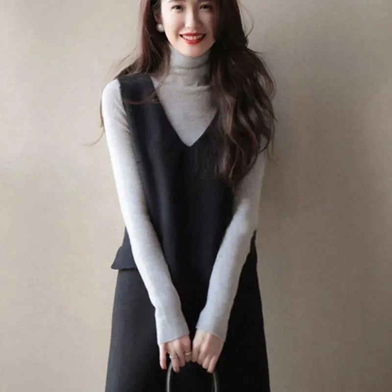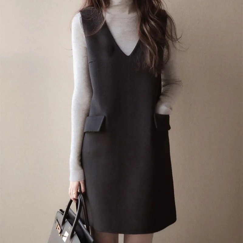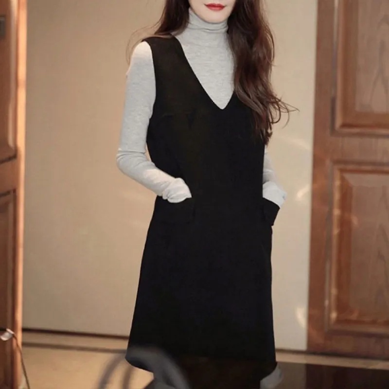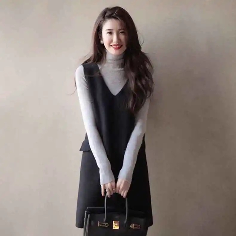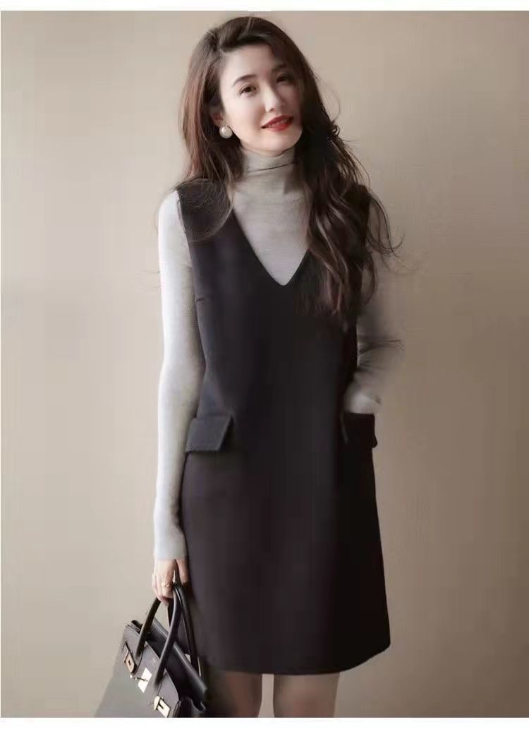 9005 ウールベストスカート女性のための春と秋のフレンチデザインミドル丈ノースリーブ黒 A ラインスカート春ノースリーブ