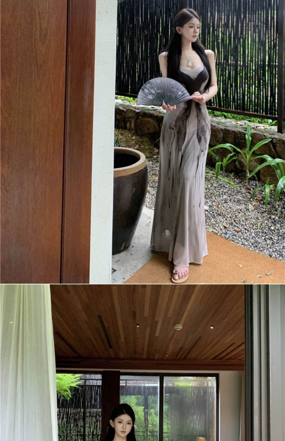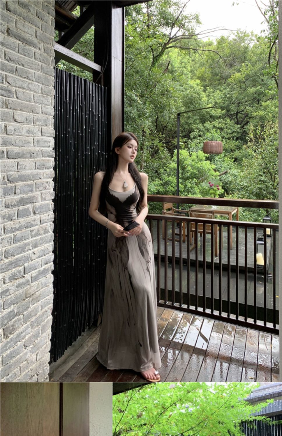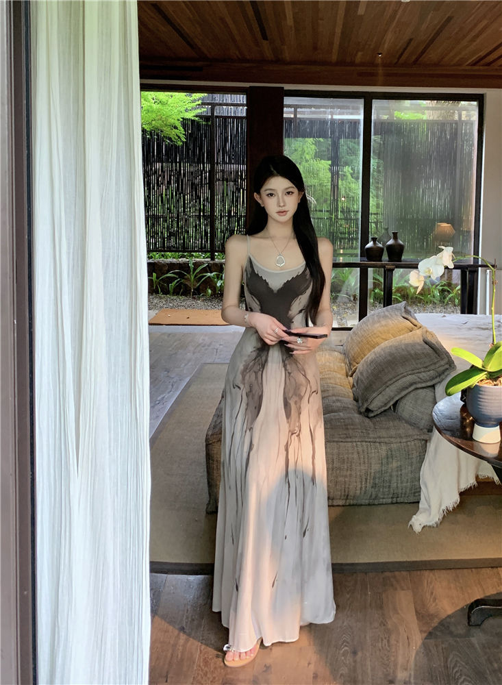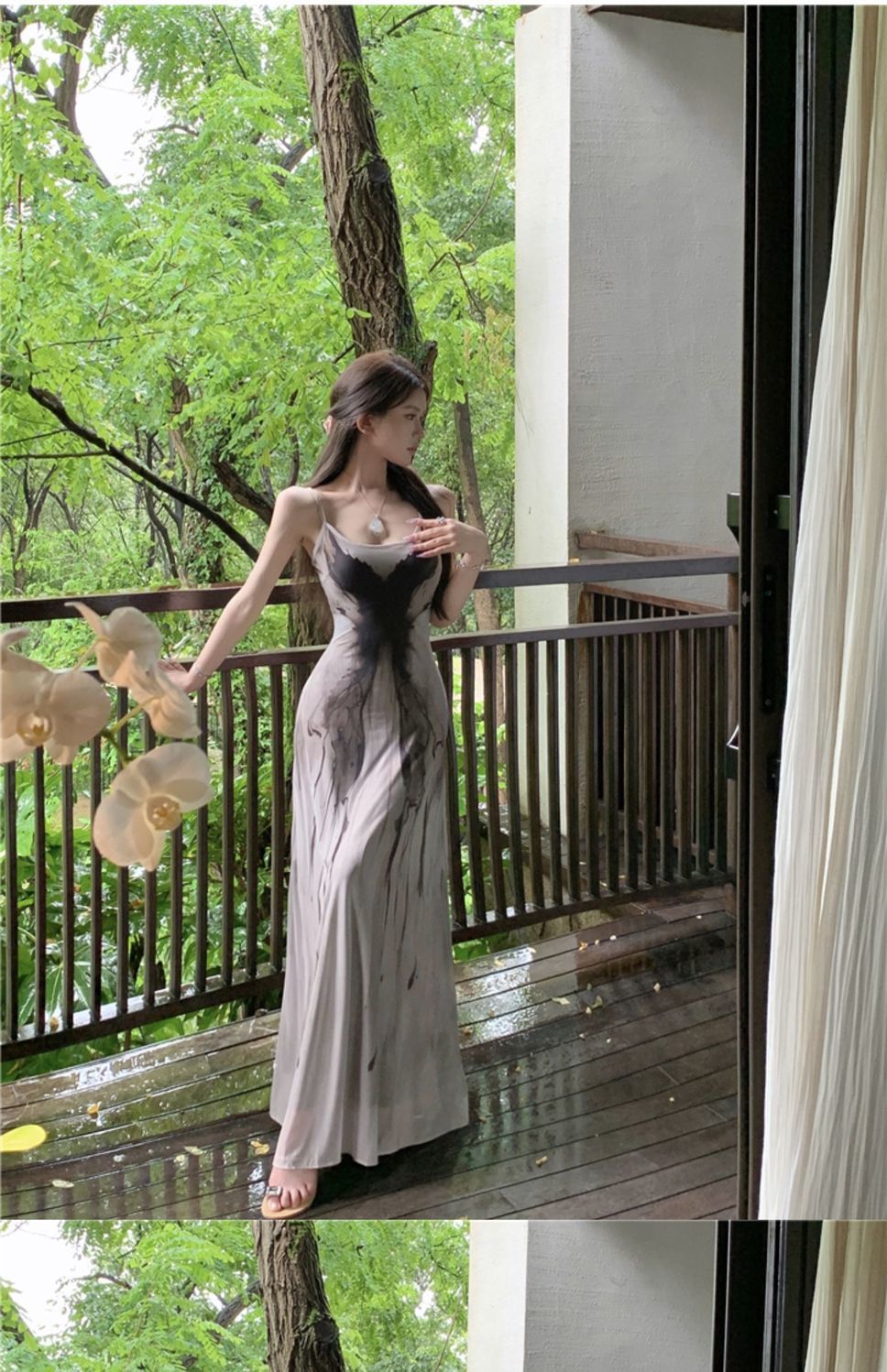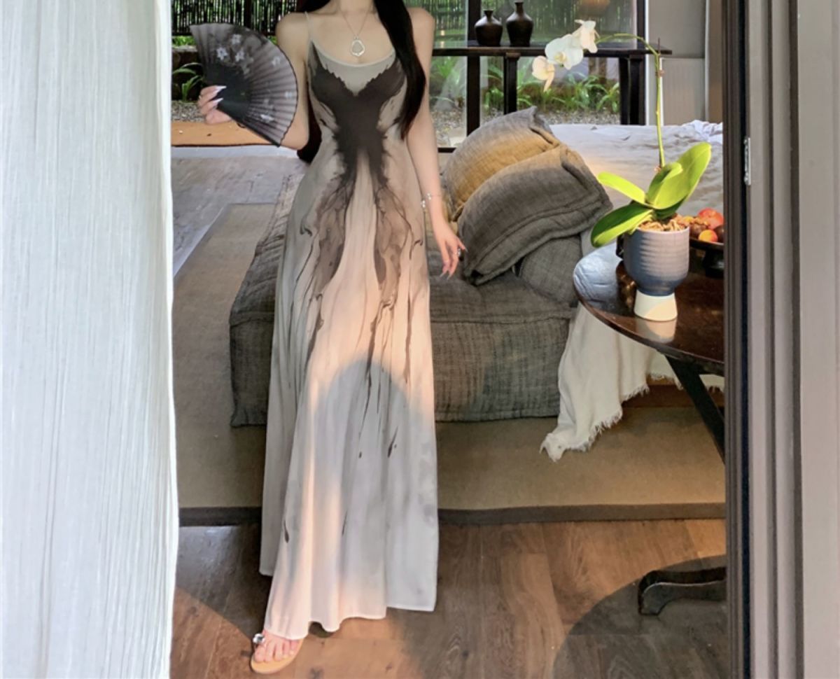 気品の驚くべきストラップの長いスカートの夏の2024の新型のリゾート風の超仙森系の砕花の高腰の顕のワンピース