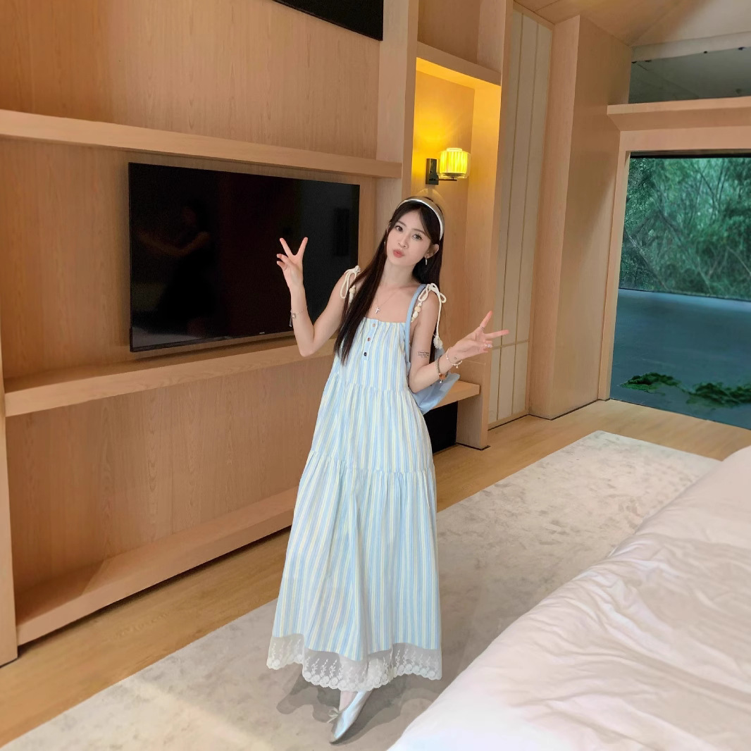 優しい風の海辺の休暇のストライプのストラップのワンピースの子供の夏の新型のフランスの気質のゆったりしている小さい背の長いスカート