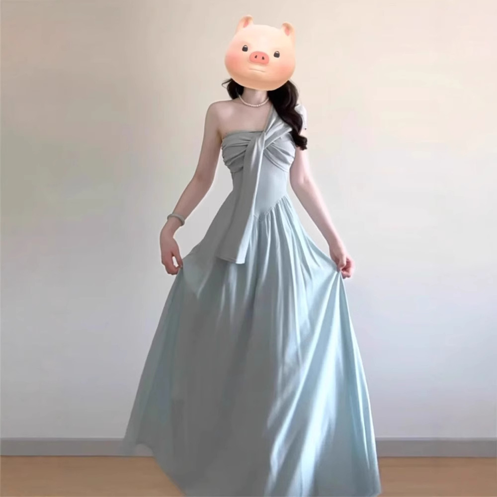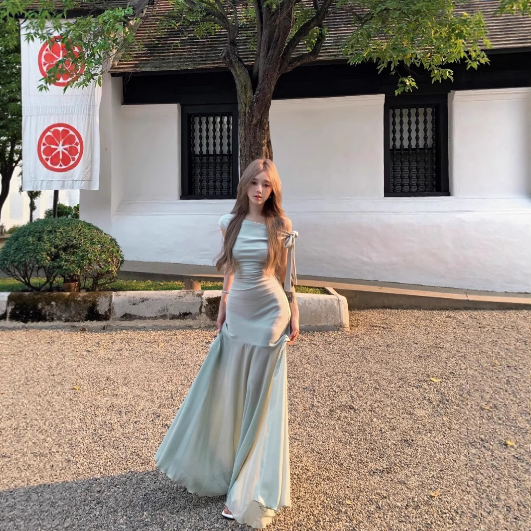 ピュアセクシースタイルフレンチグリーンワンショルダーオフショルダーニットドレス女性用海辺休暇ウエスト気質ロングスカート