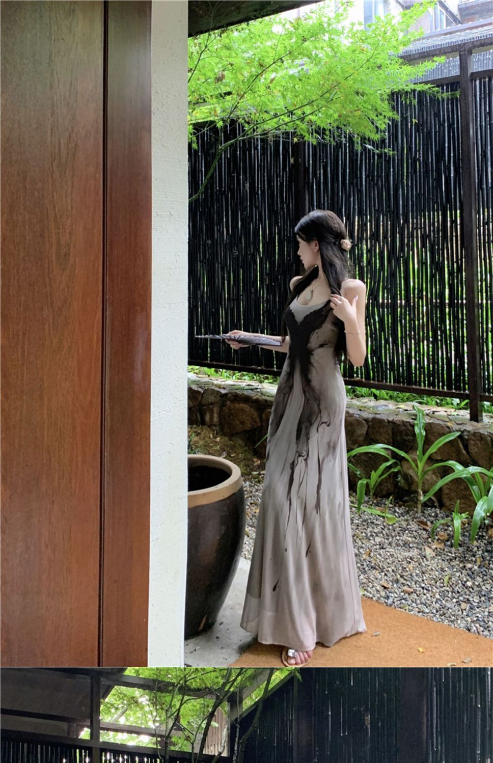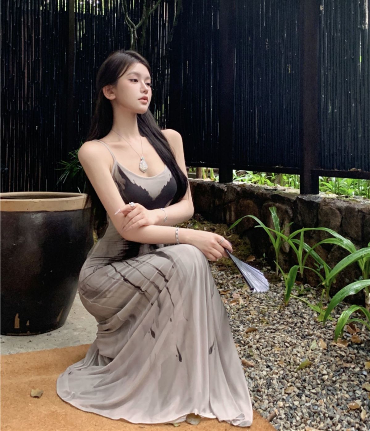 レトロな冷たい薄緑の純粋なストラップのワンピースの夏の新型のプリントの長いスカートの気質の緑色の小さい大衆はやせています。