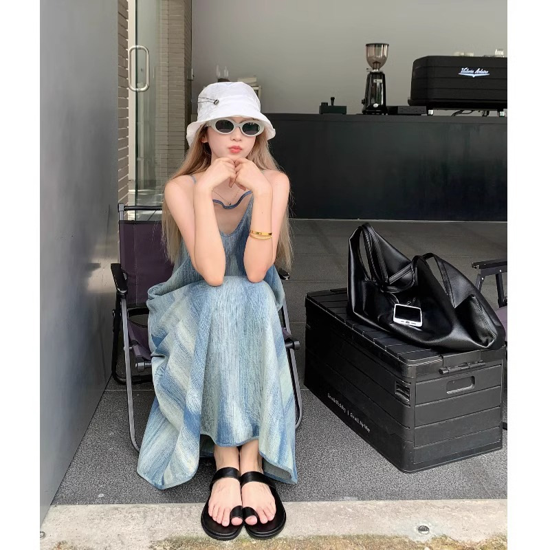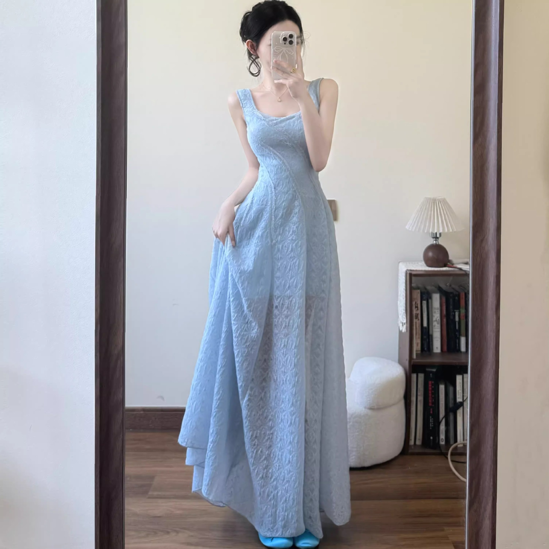 夏の青いフランスのストラップのワンピースの女性2025の新型の気質は腰を収めてやせているa字の海辺の休暇のスカートを現します。