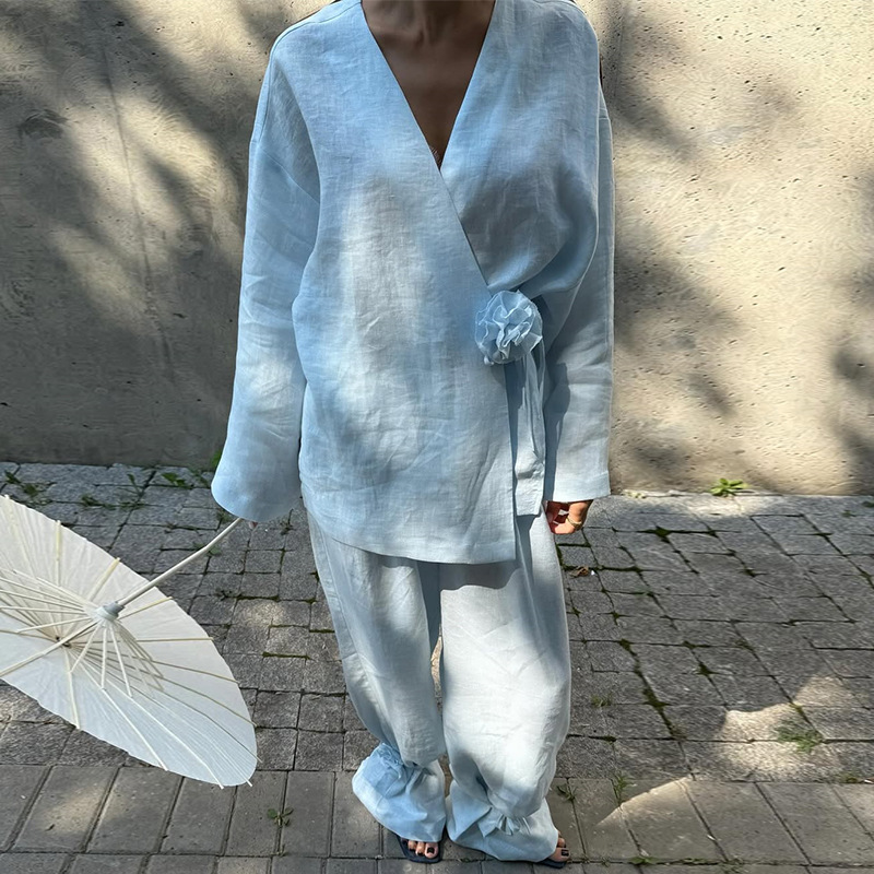 欧美跨境女装2025秋季新款休闲V领长袖花朵开衫外套阔腿长裤套装