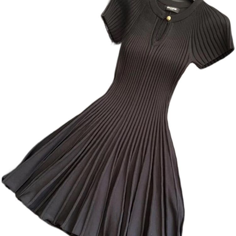 2025 春夏の新スタイルプリーツ裾フレンチステッチエレガントな黒の半袖ドレス痩身女性ニット