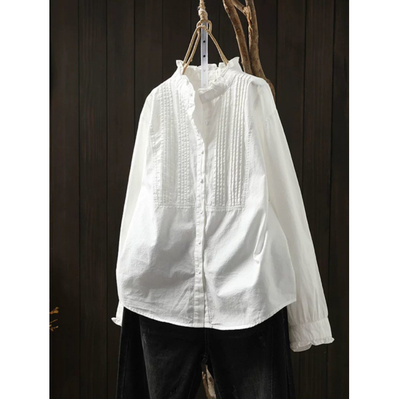 春の女性用フレンチホワイトスタンドカラーシャーリングシャツ、レトロな長袖デザイン、ニッチなインナーレーストップ
