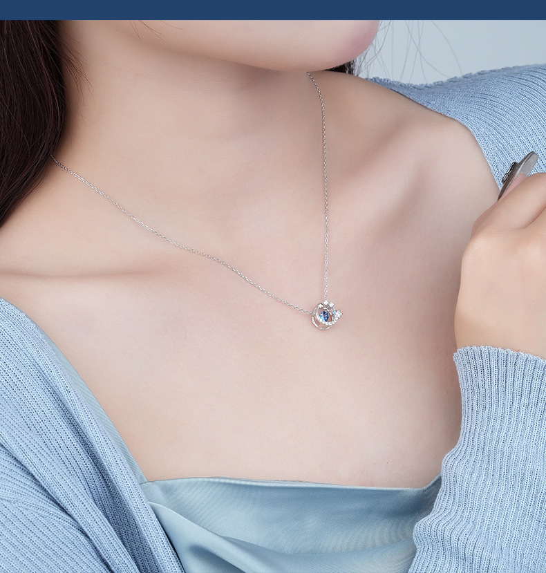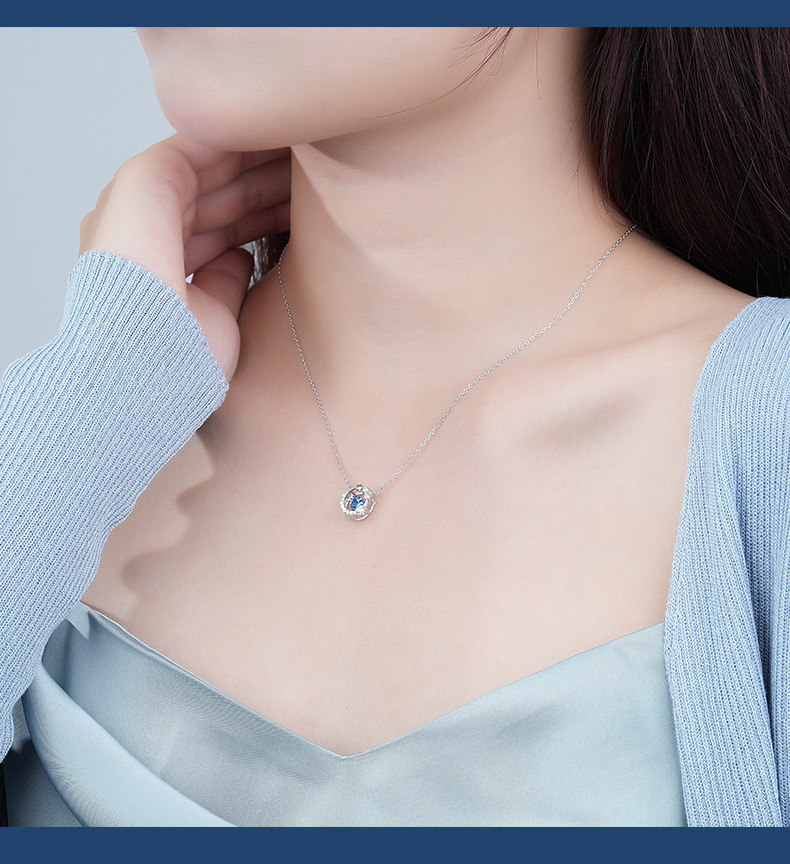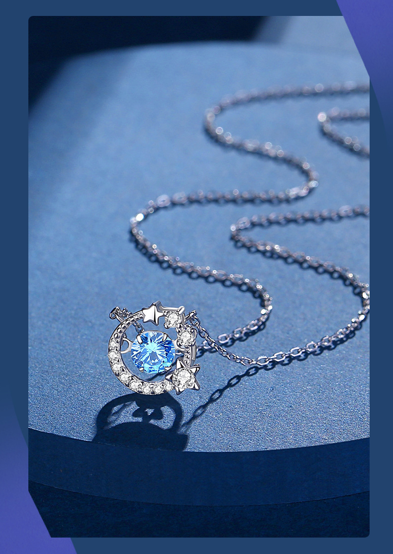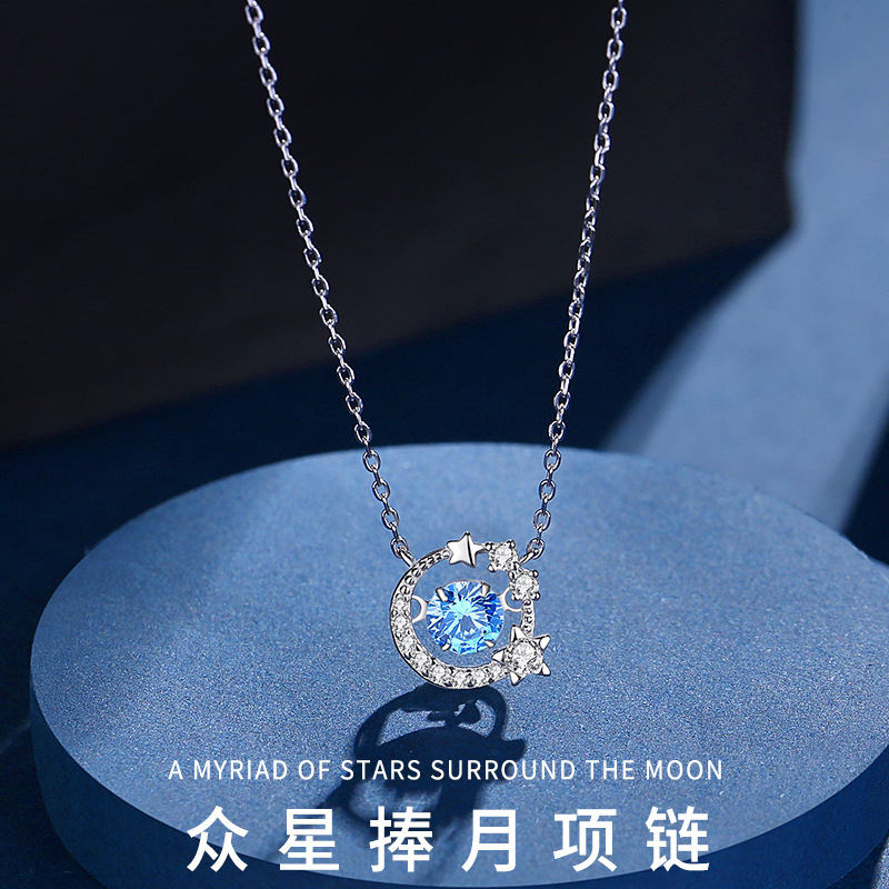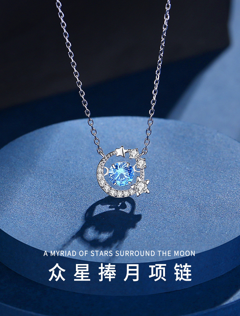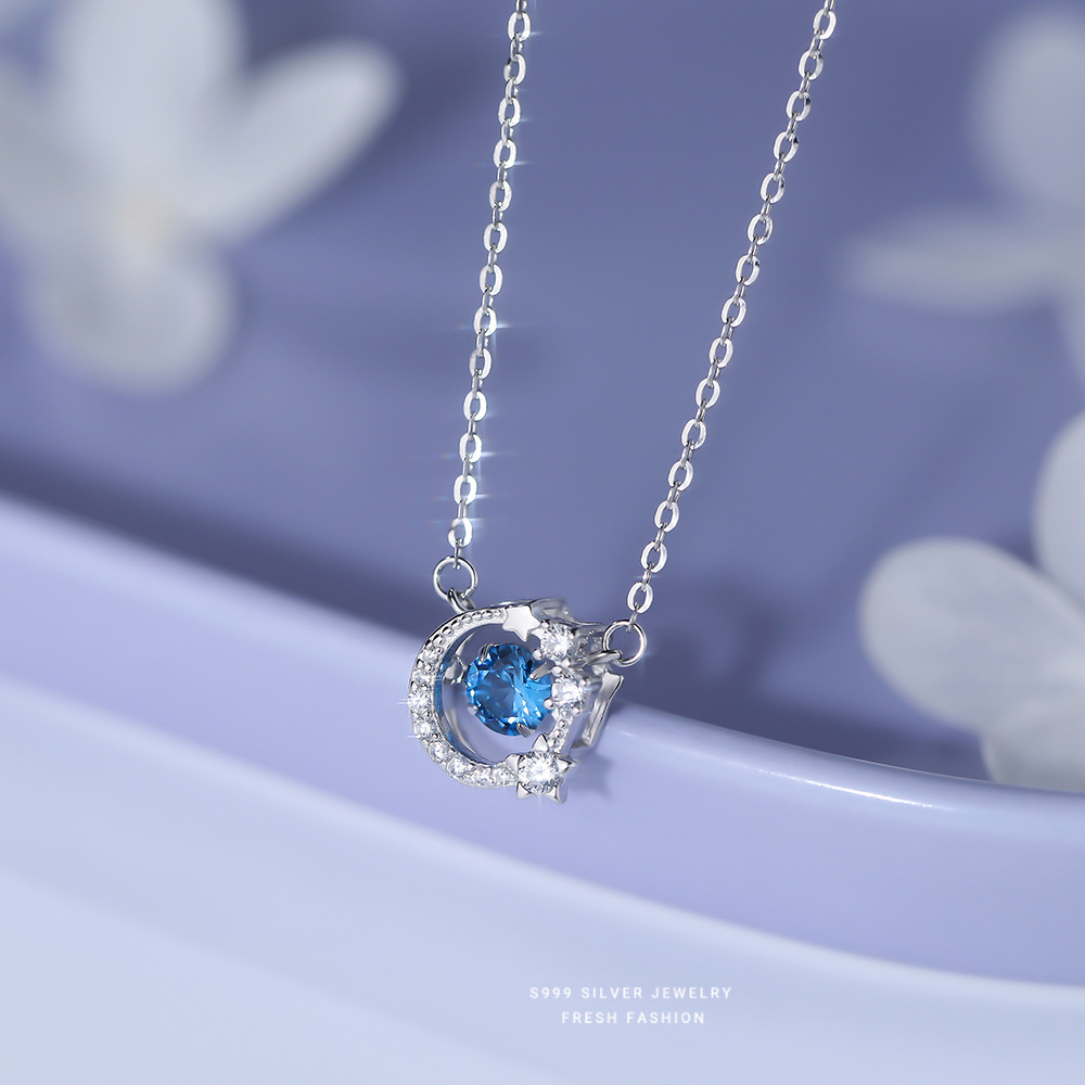 S999 スターリングシルバーの女性用の小さな新鮮でスマートなスピネルネックレス、ライトブルーの星が月を支えるペンダント、ニッチデザインの鎖骨チェーン