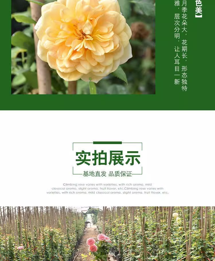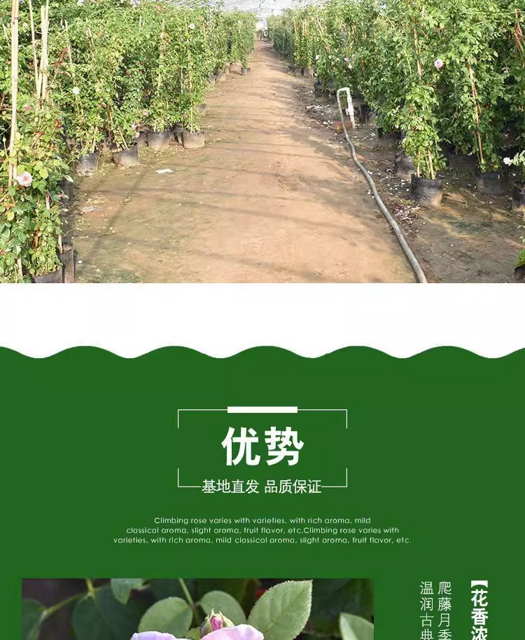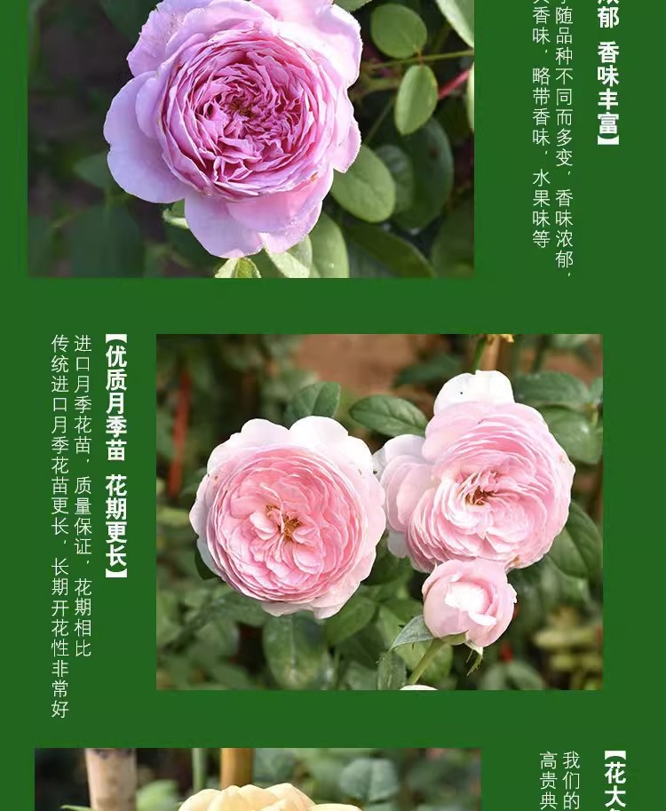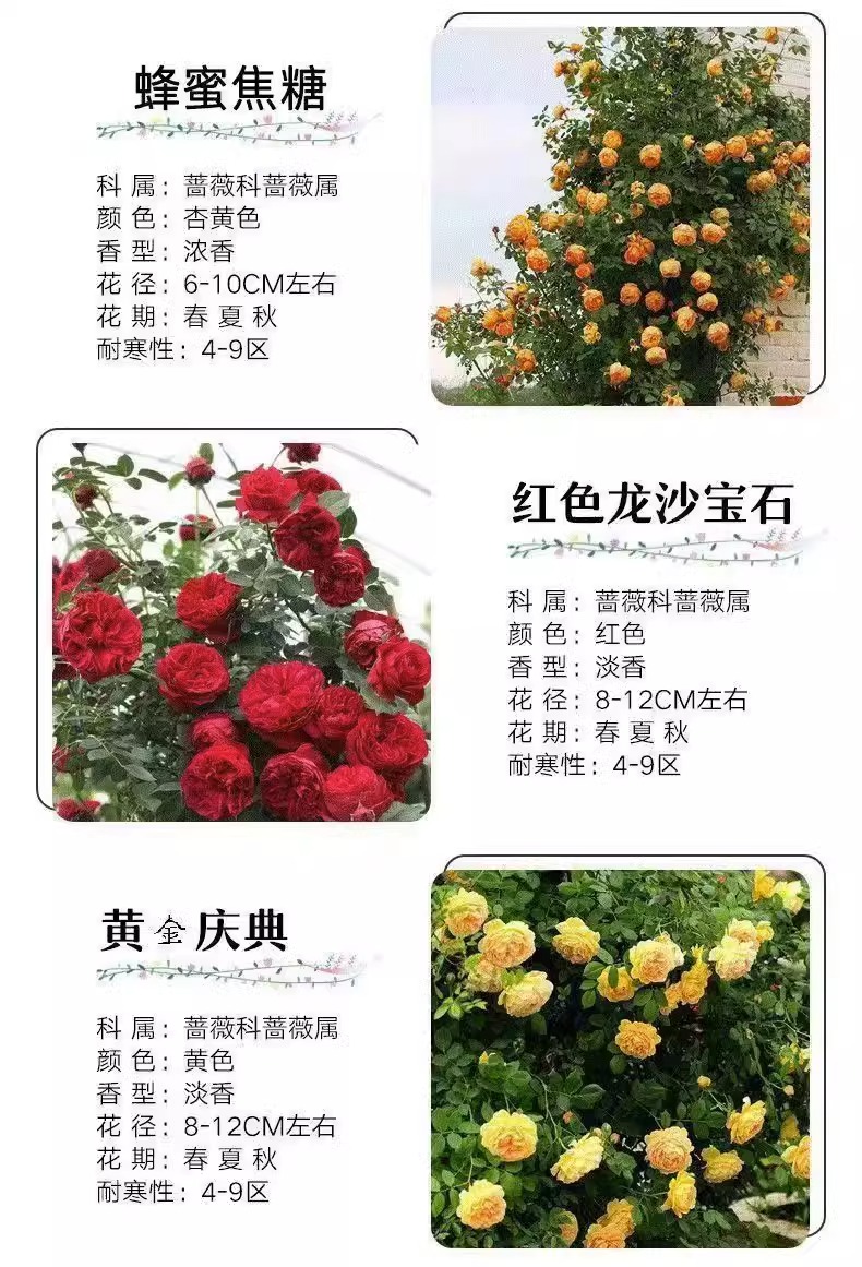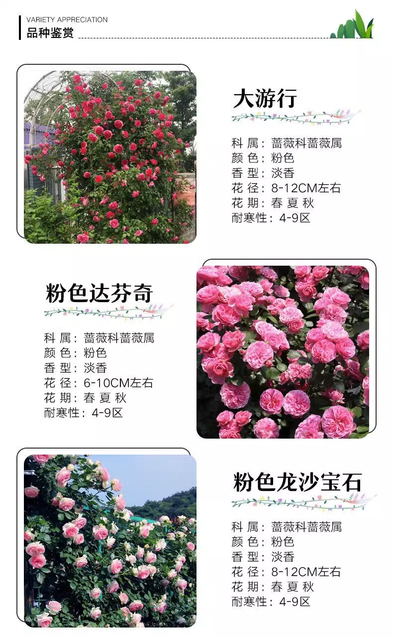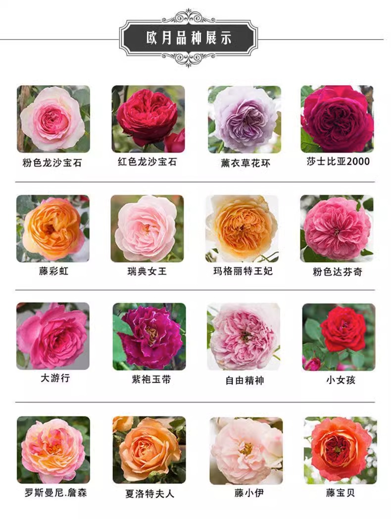 1.粉色龙沙宝石【开花爆满大花浓香】,2.粉色达芬奇【四季开花 大花】,3.蜂蜜焦糖【四季开花 大花】,4.红色龙沙宝石【四季开花 大花 浓香】,5.黄金庆典【四季开花 大花 浓香】,6.安吉拉【多季开花 小花爆满 浓香】,7.佛罗伦蒂娜【四季开花 大花 浓香】,8.大游行【四季开花 大花】,9.蓝色阴雨【四季开花 多头中花爆满】,10.罗伊【四季开花 大花浓香】,11.鲁硕红【四季开花 大花】,12.玛格丽特王妃【四季开花 大花 浓香】,13.瑞典女王【四季开花 大花】,14.莎士比亚【四季开花 浓香】,15.藤宝贝【四季开花 大花】,16.藤本小女孩【四季开花 小花爆满】,17.藤彩虹【多色花 四季开花中花爆满】,18.藤小伊【四季开花 中花 爆满】,19.甜梦【四季开花 中花 爆满】,20.我的心【四季开花 大花 浓香】,21.夏洛特夫人【四季开花 大花】,22.薰衣草花环【多头中花 爆满】,23.胭脂扣【四季开花 清香】,24.詹森【四季开花 大花】,25.自由精神【四季开花 大花 浓香】,26.白木香蔷薇【小花爆满浓香】,27.红木香蔷薇【无刺 四季开花爆满】,28.黄木香蔷薇【无刺 四季开花 爆满】