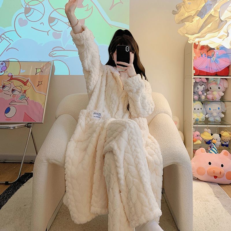 2024年の新型コーラルベルベットのパジャマ女性秋冬の寝衣のロングタイプのベルベットはフランネルの家庭服セットを厚くした
