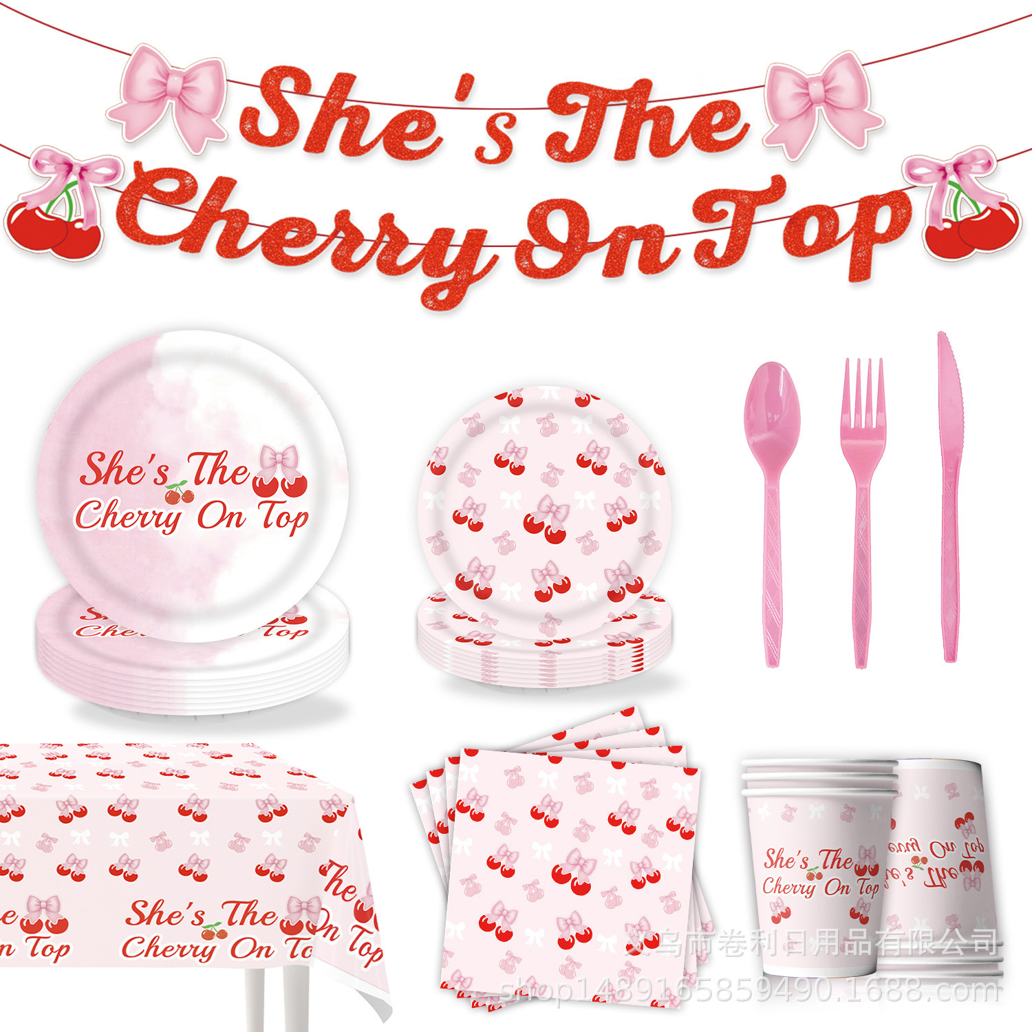 チェリーボウ女の子诞生日テーマパーティー装饰用品バナーケーキフラッグバルーンCherryセット