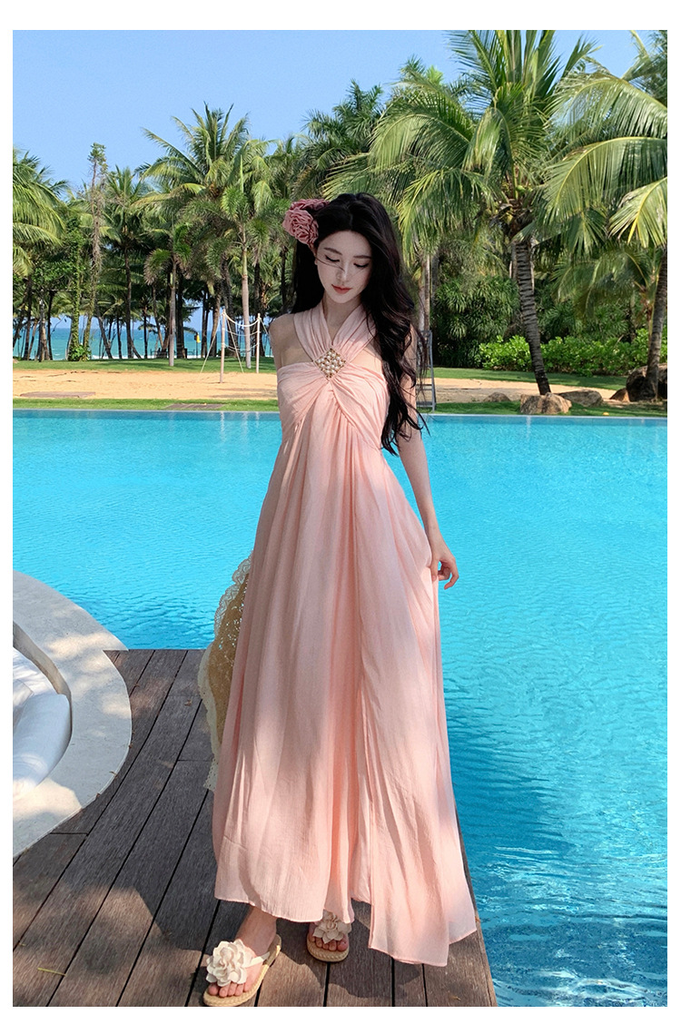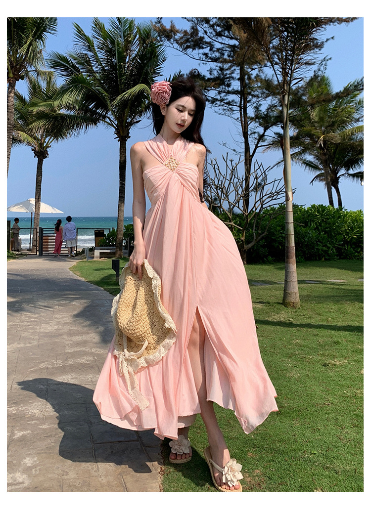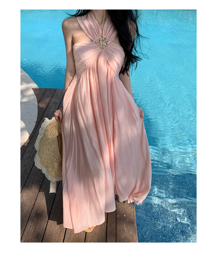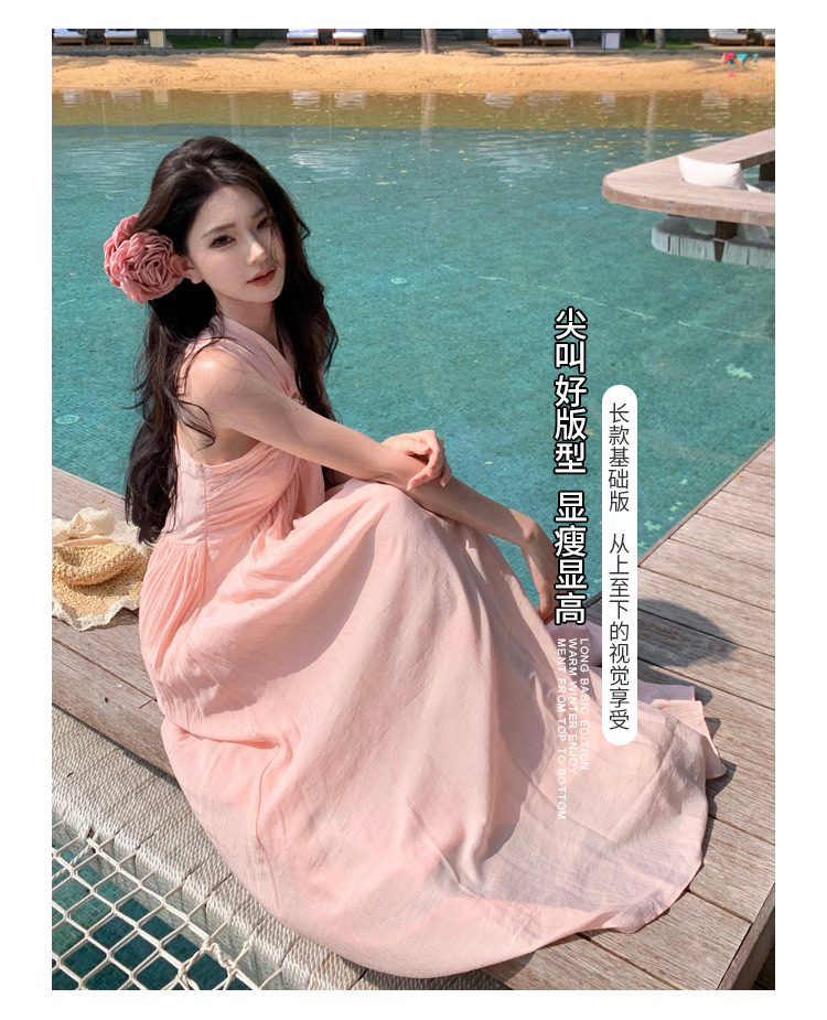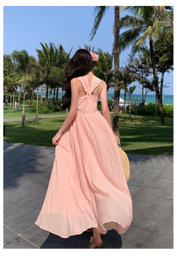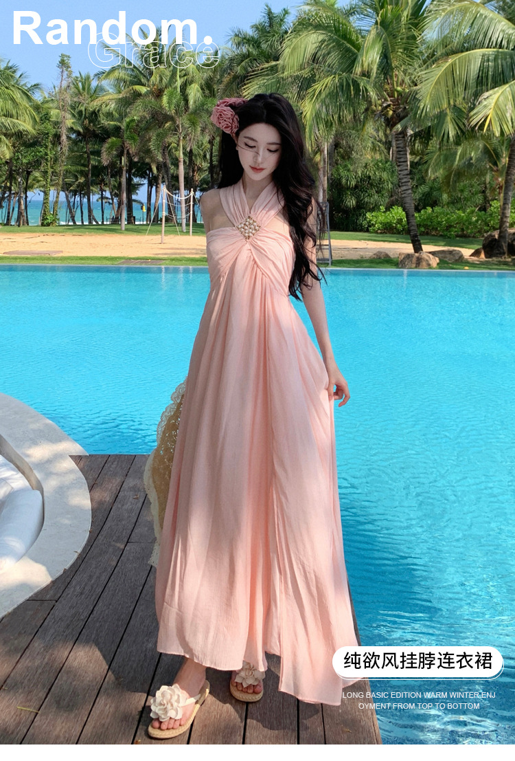 2025年新作ピンクの首掛けロングスカート神女風リゾートワンピース春装女海島ビーチ着着スカート