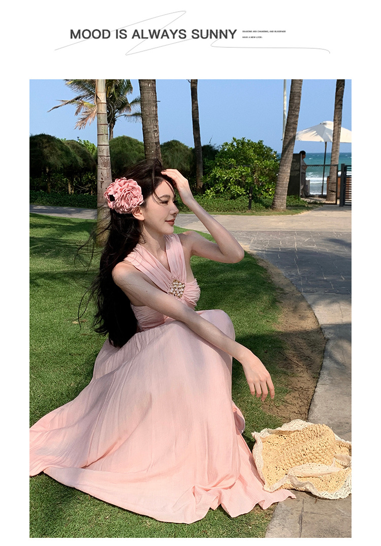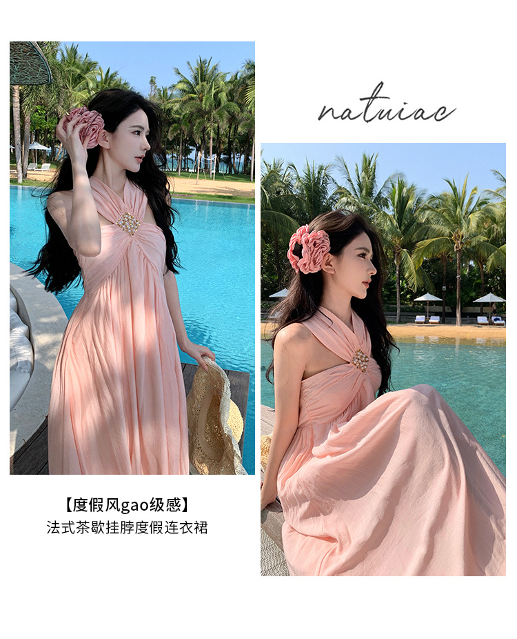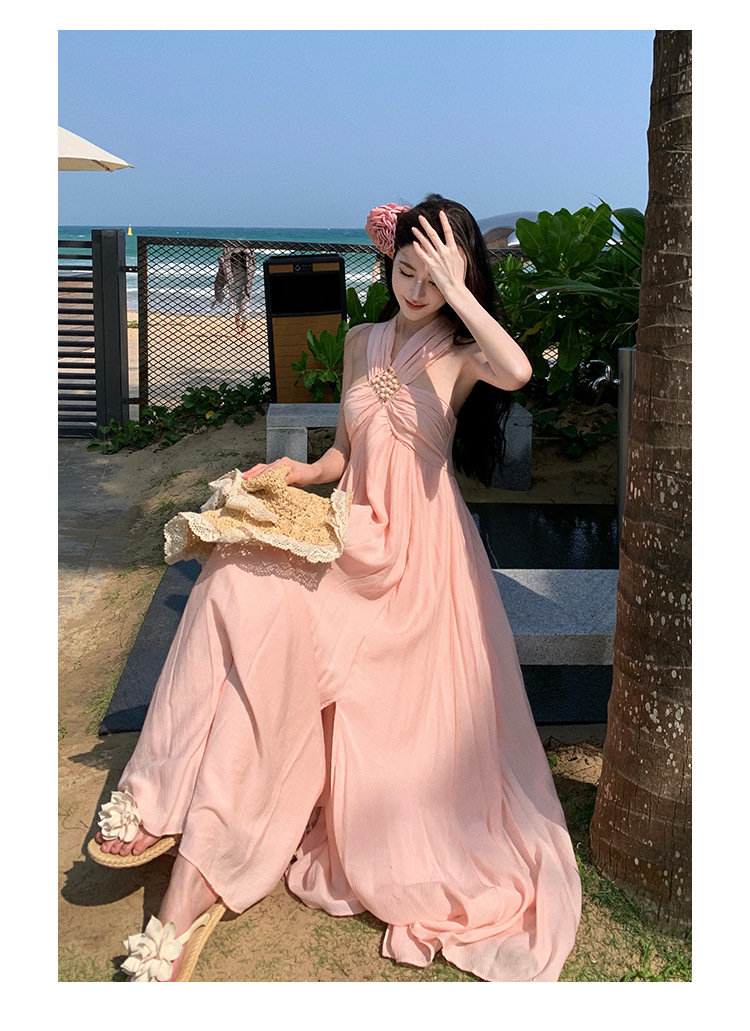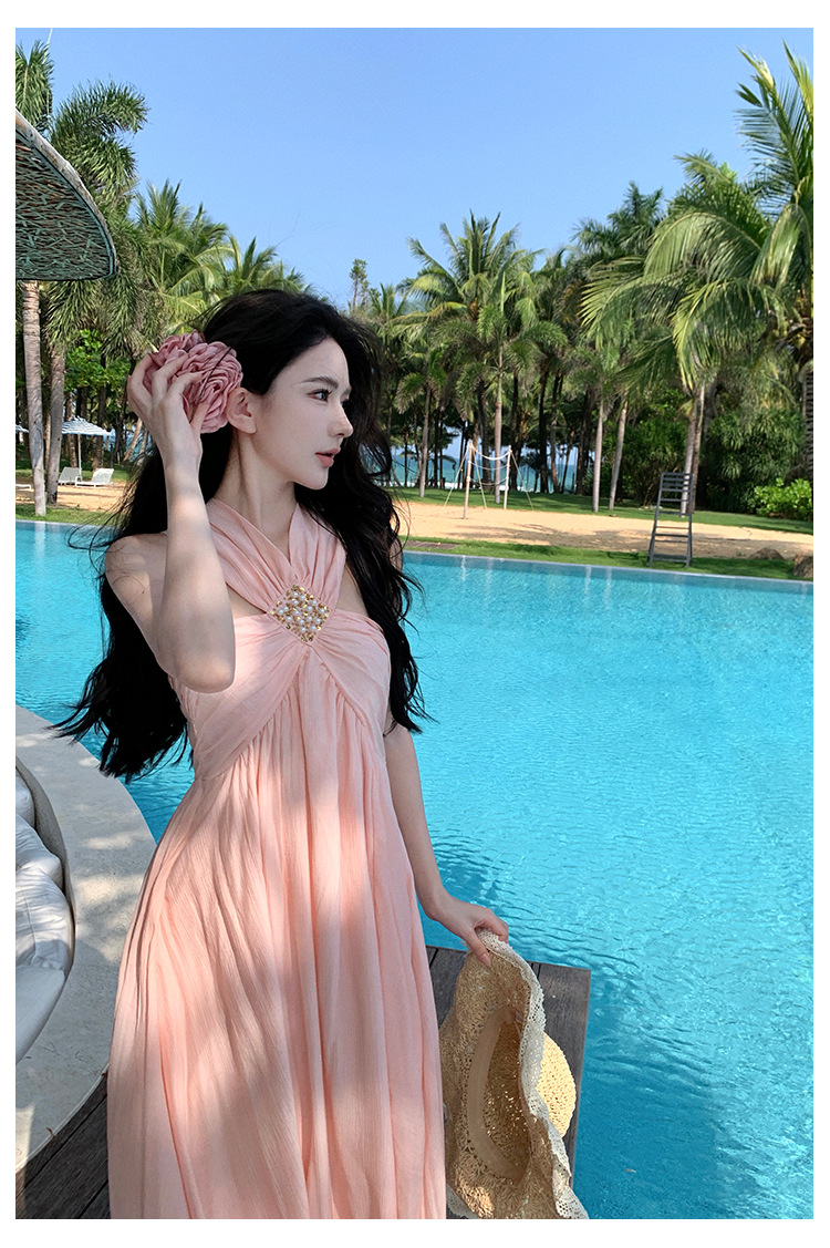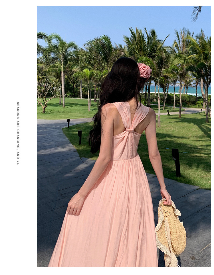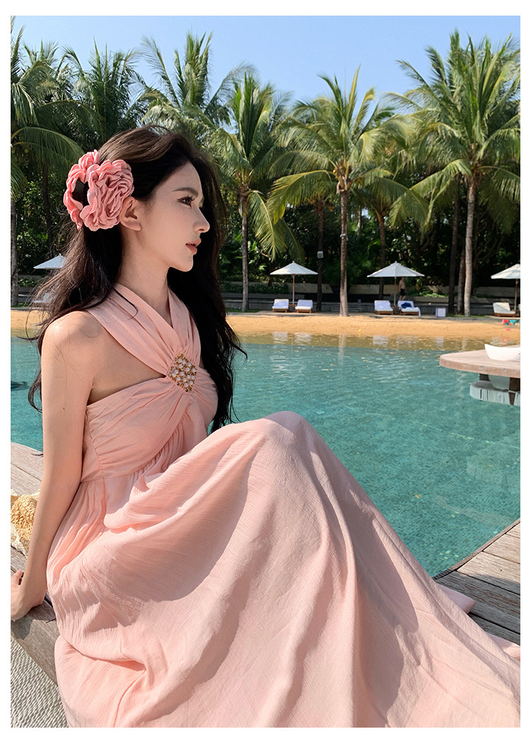 2025年新作ピンクの首掛けロングスカート神女風リゾートワンピース春装女海島ビーチ着着スカート