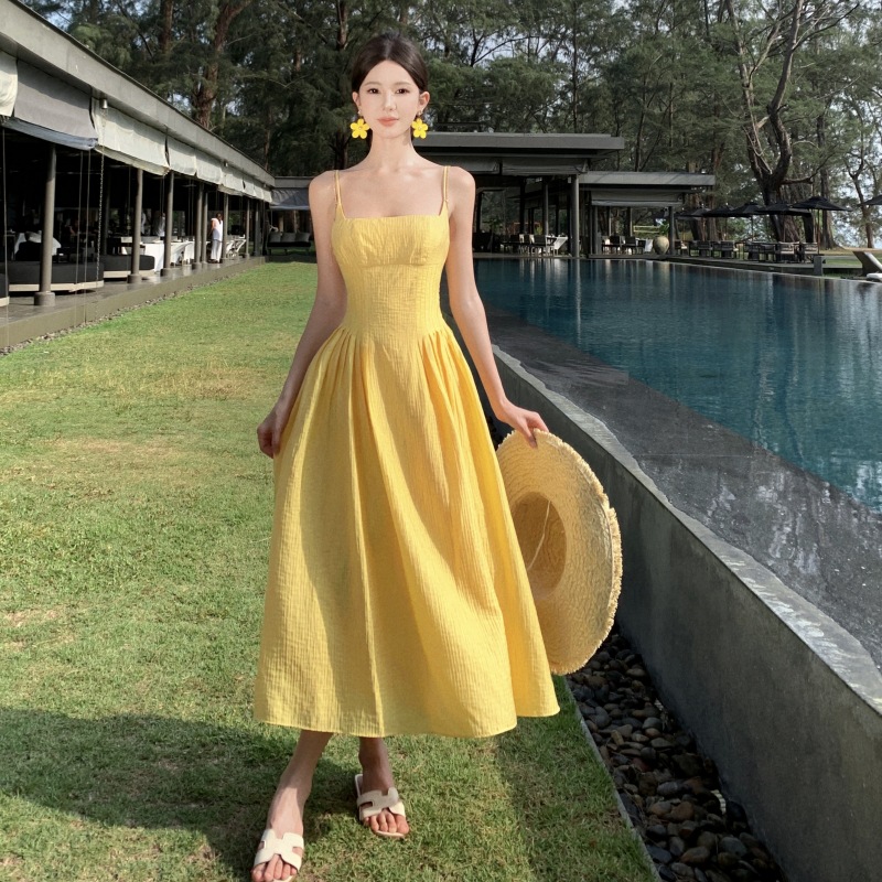 フレンチスタイルの背中見せセクシーな黄色のサロペットワンピース、夏の新作サロペットワンピース、ウエストシェイプロングワンピース、島のリゾートワンピース