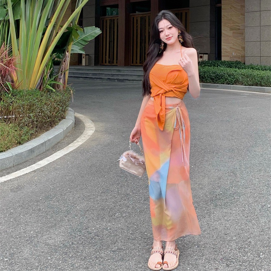 夏のドーパミンのリゾート風のスーツのセクシーな袖のない胸の上着のオレンジ色の染めのデザインの小さい衆の長いスカート