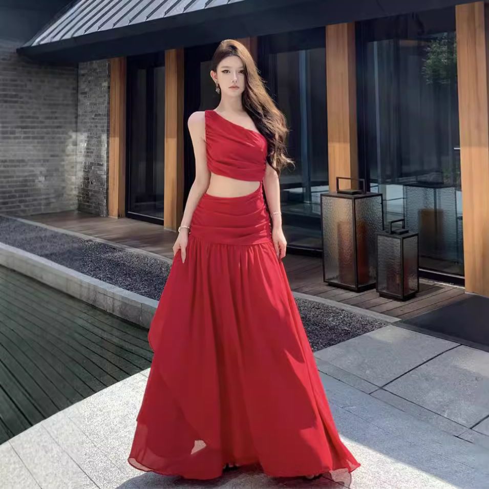 海辺の旅行は赤い休暇ワンピース砂漠の写真スカートを着て高級感のある赤いスカートを着てビーチのスカートを漂っている