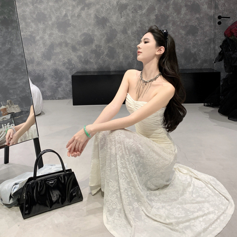 Xialan Xiyu ベージュフローティングハイエンドプリーツチューブトップスカートウエスト痩身ドレス女性春