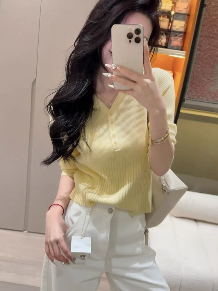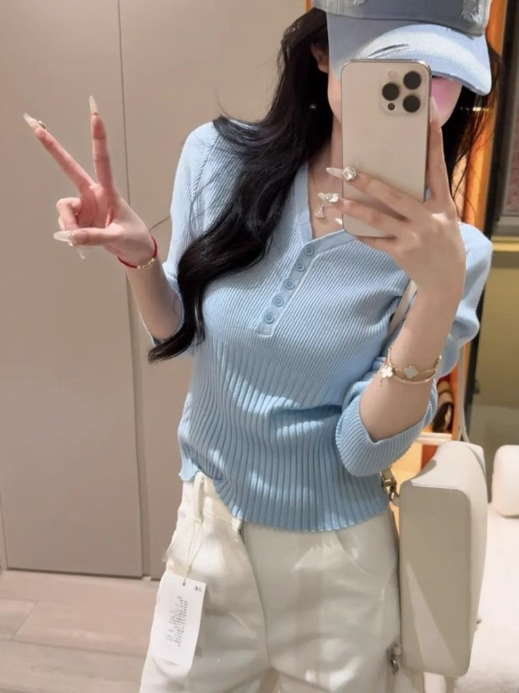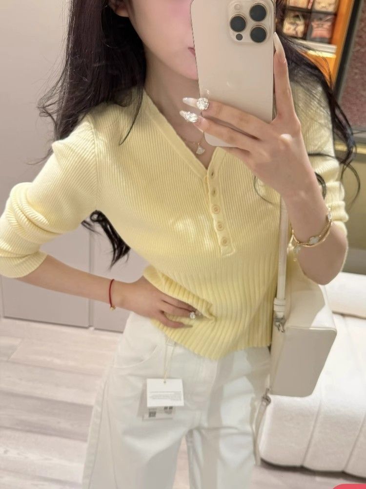 秋冬vネックの雰囲気のデザイン感のあるニットの中にカーディガンの女性のスリムなセーターの底のシャツの高級感の上着があります。
