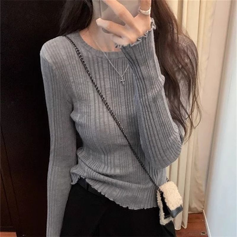 法式针织打底衫坑条简约圆领上衣女秋冬新款木耳边设计感内搭毛衣