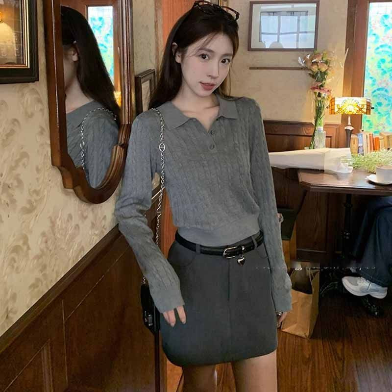复古麻花翻领针织衫女长袖外穿打底短款polo领百搭毛衣上衣早秋季