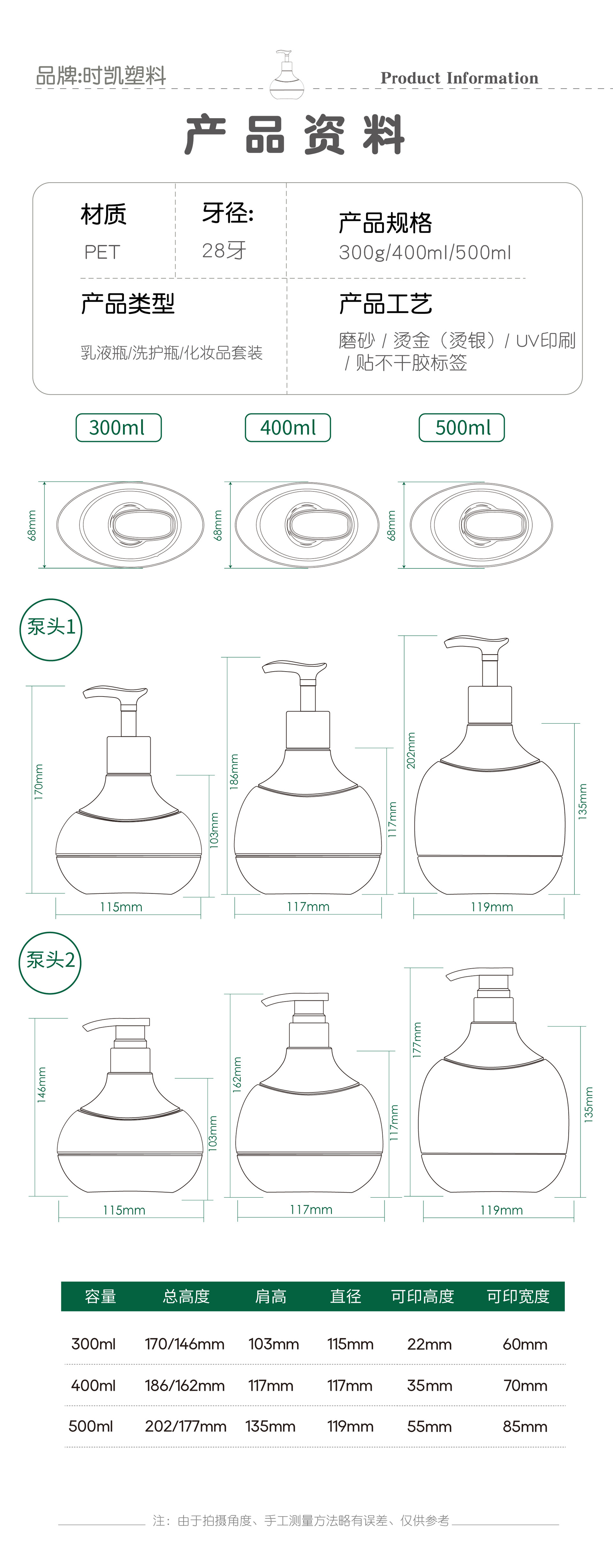 300/400/500mlPE洗护瓶按压式乳液洗手液瓶沐浴露洗发水分装瓶子
