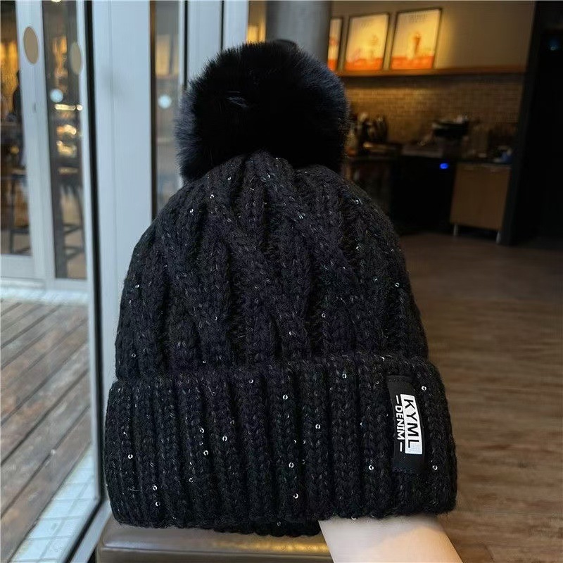 新款韩国毛球亮片毛线帽女秋冬加厚保暖可爱毛球帽子百搭针织帽潮