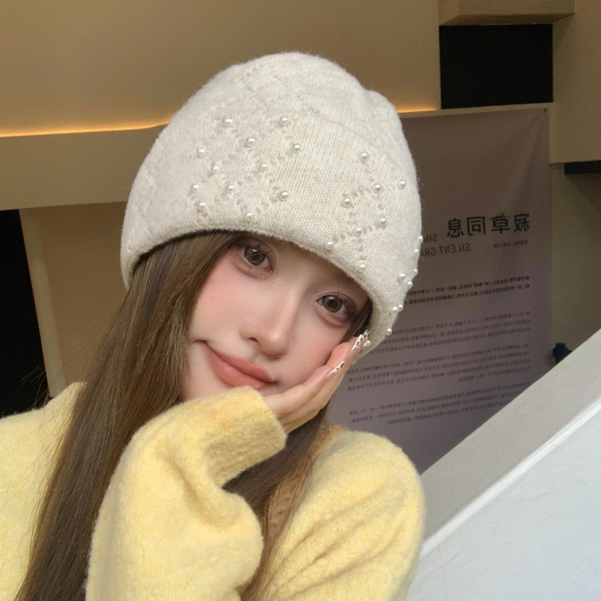 韩版百搭格纹珍珠针织帽子女秋冬新款时尚保暖护耳毛线帽包头冷帽