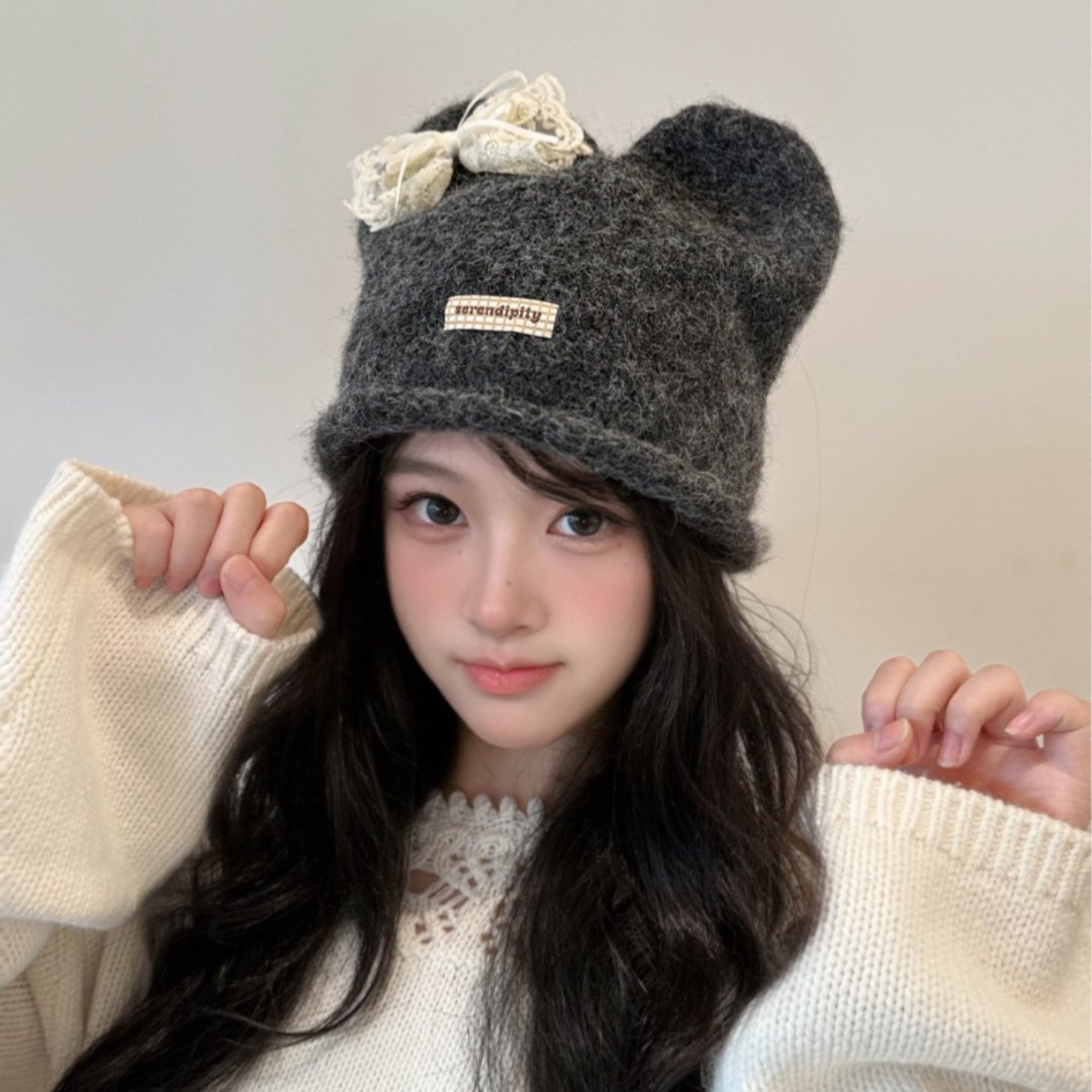 2025蝴蝶结猫耳朵毛线帽子女冬季加厚保暖针织帽日系可爱护耳冷帽