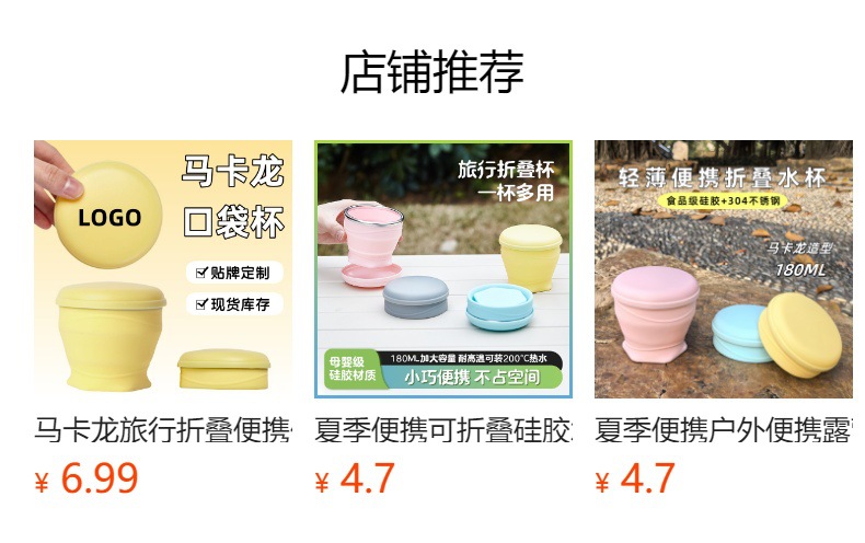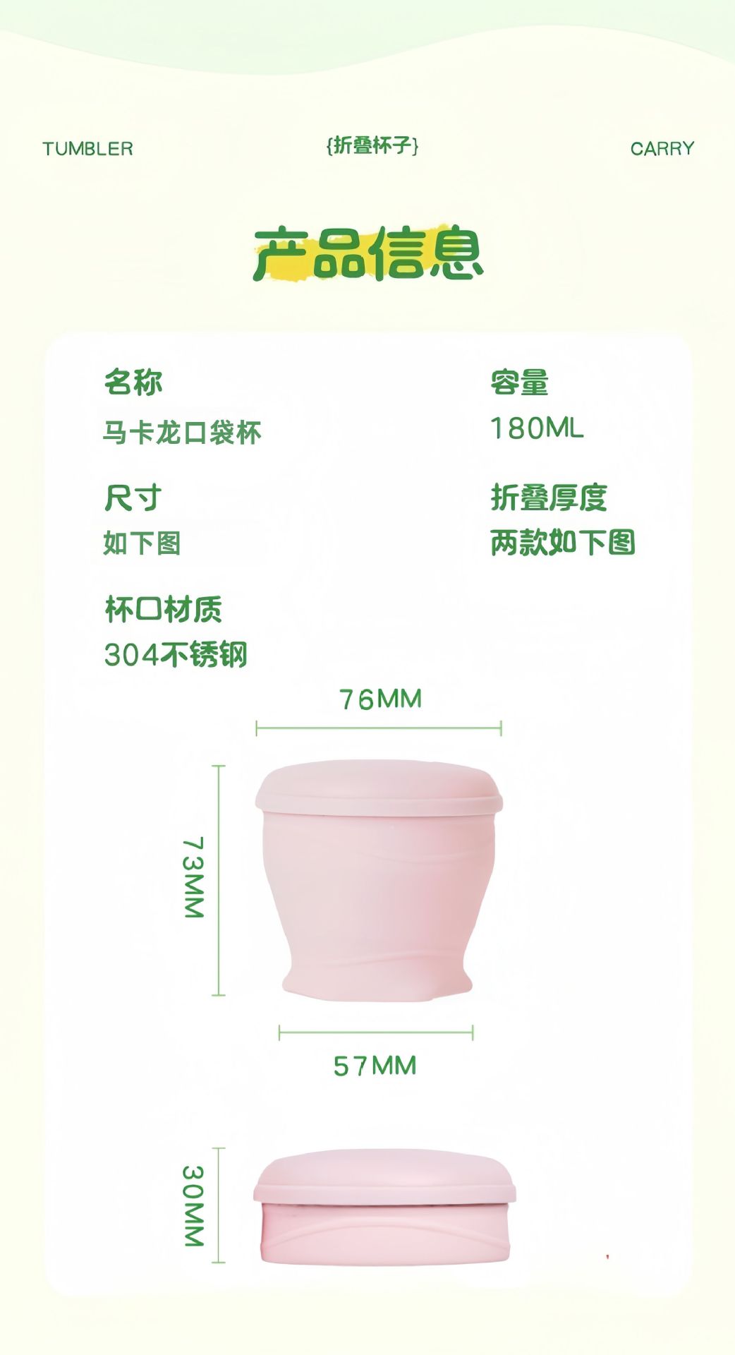 马卡龙口袋杯(S22)参数:1.材质:食品级硅胶+304不锈钢 2.尺寸:87*140(58)mm 彩盒尺寸:76*76*73(30)cm 3.容量:180ml 4.重量:68g 5.包装:OPP袋(彩盒+0.2元)