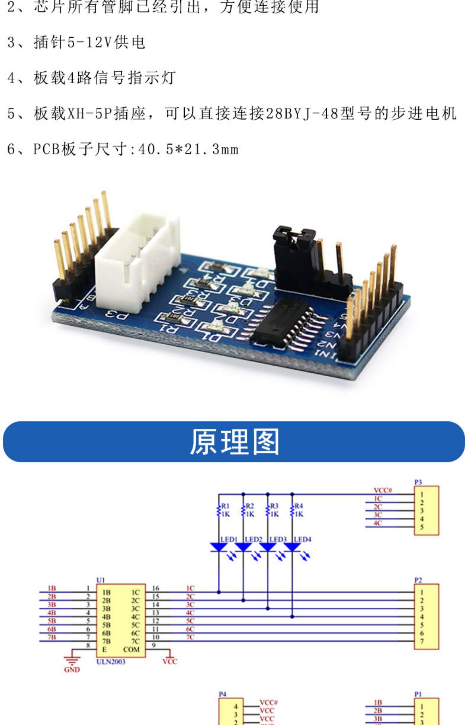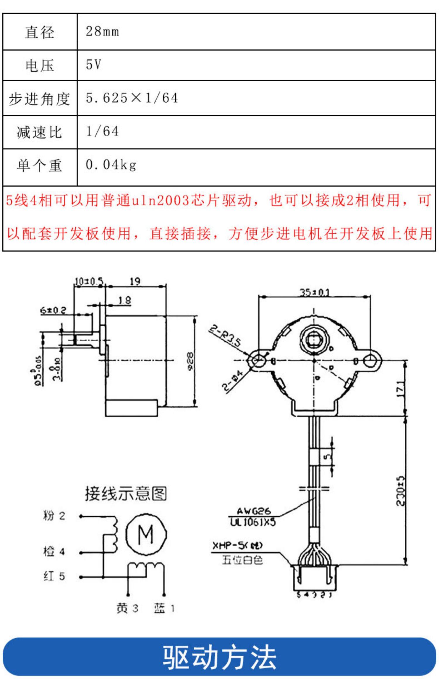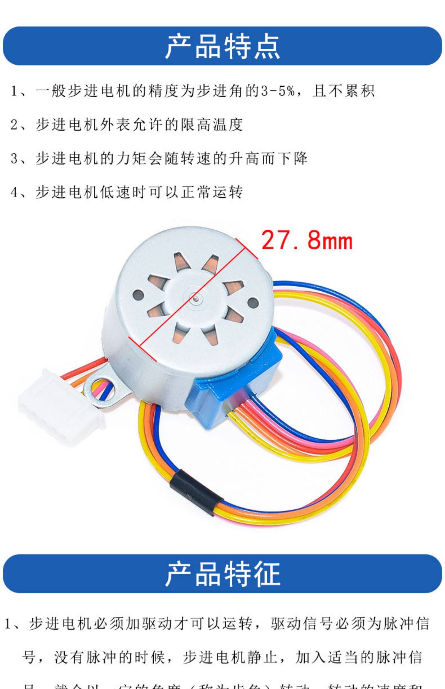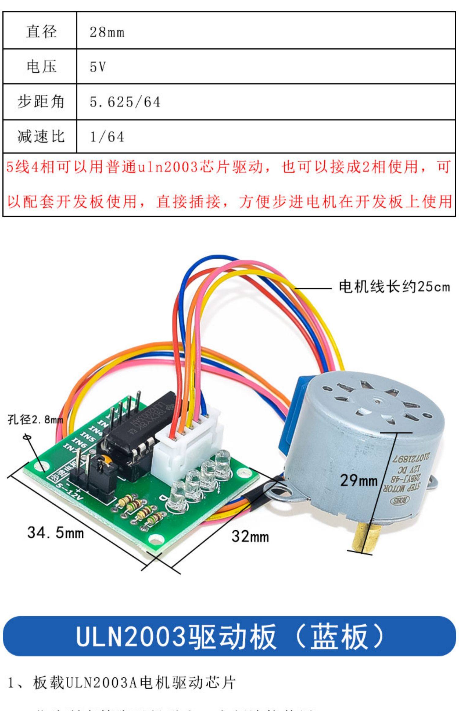 应用:5线4相,可以用普通uln2003芯片驱动,也可以接成2相使用,可以配套开发板使用,直接插接,方便使用,步进电机在开发板上使用。