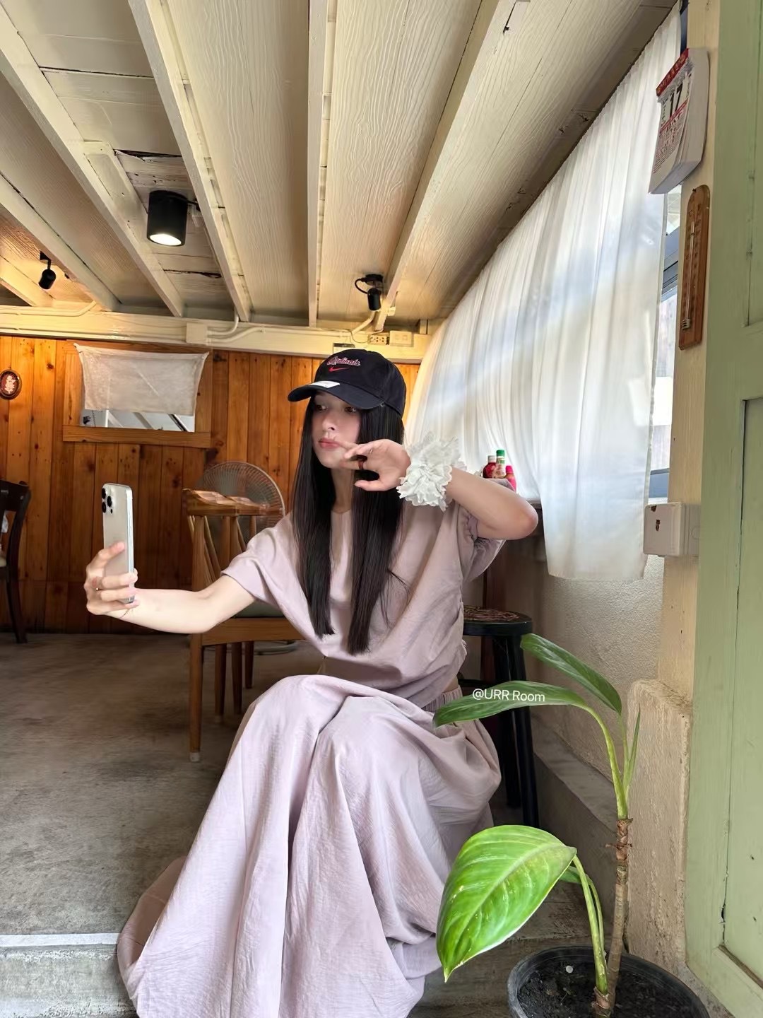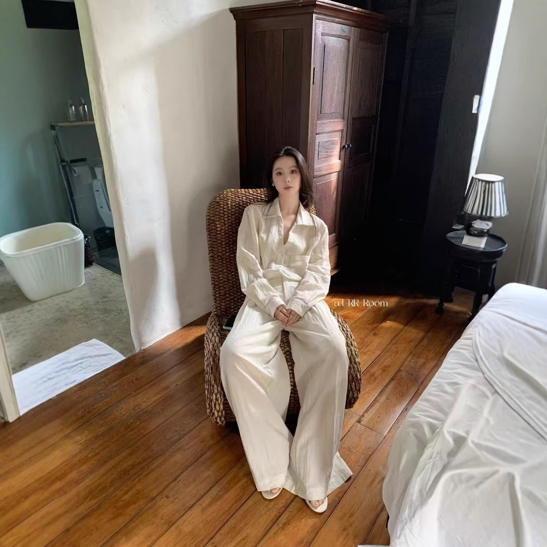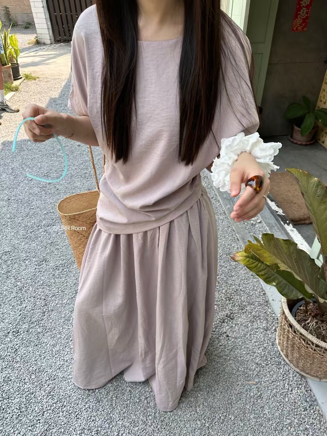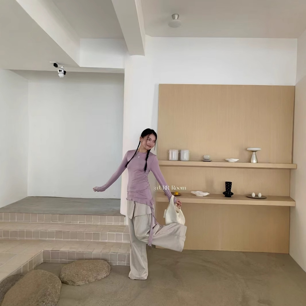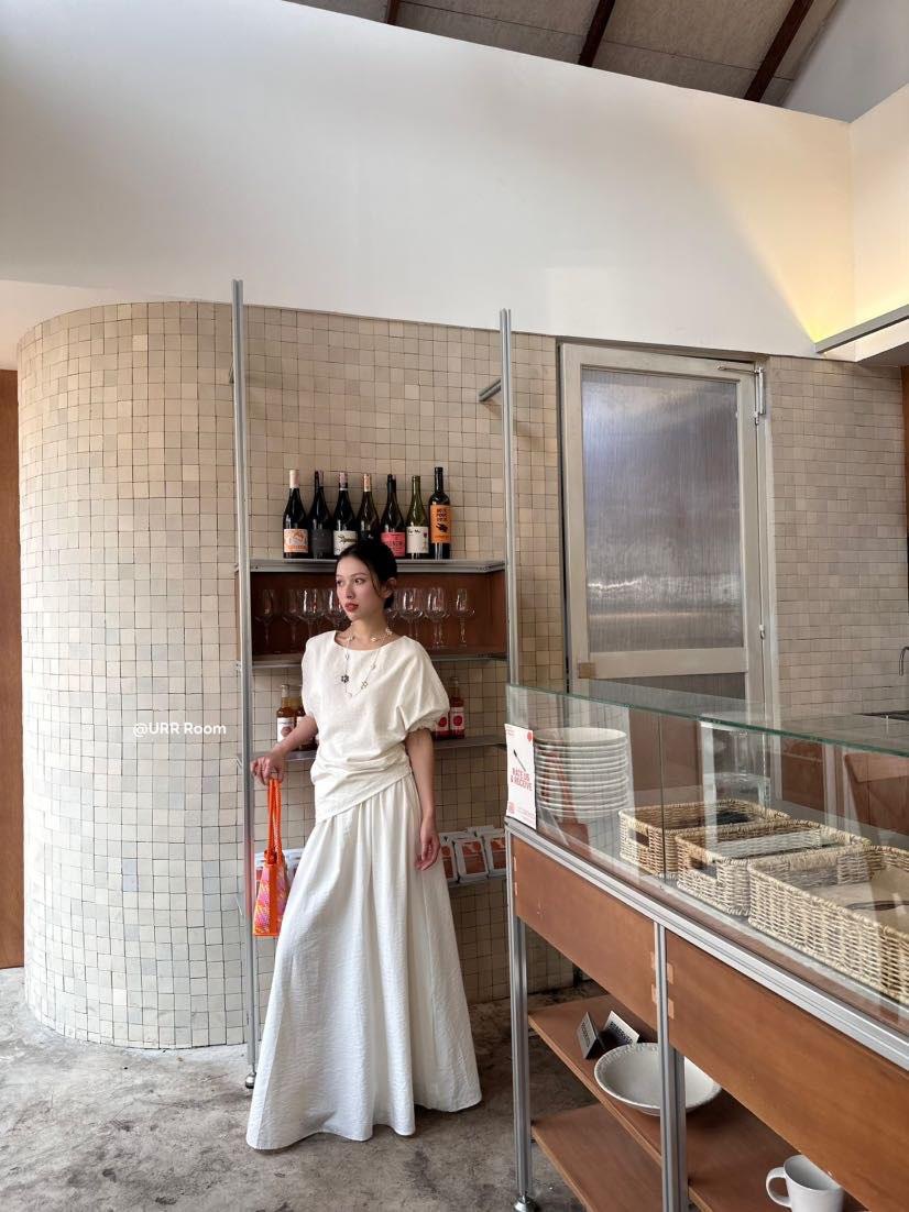 URR Room2025法式褶皱收腰T恤+双层高腰阔腿长裙半身裙慵懒两件套