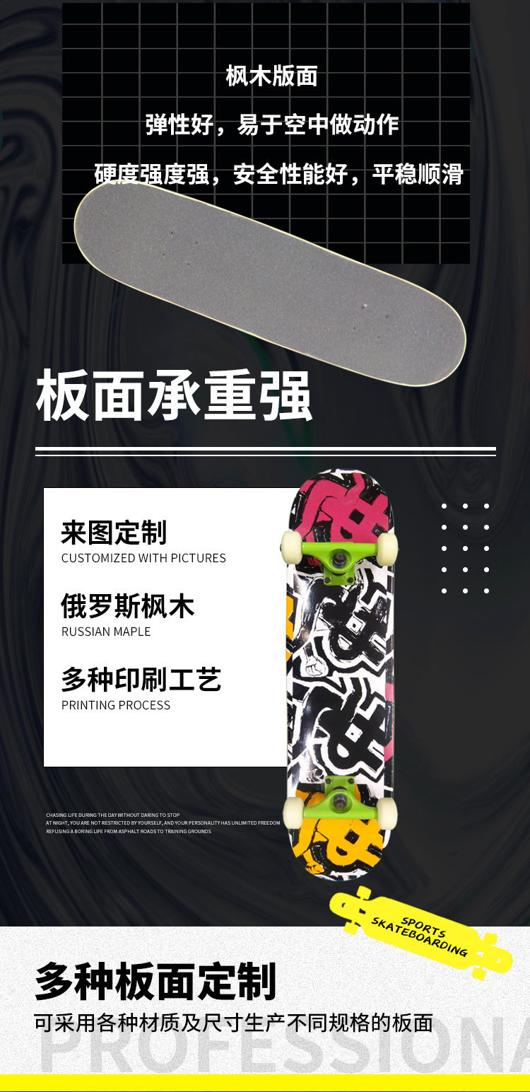 四輪スケートボードメーカー直販、厚みのあるメープル材スケートボード、ストリートボード、プロ仕様のアウトドアスポーツ、子供向け卸売