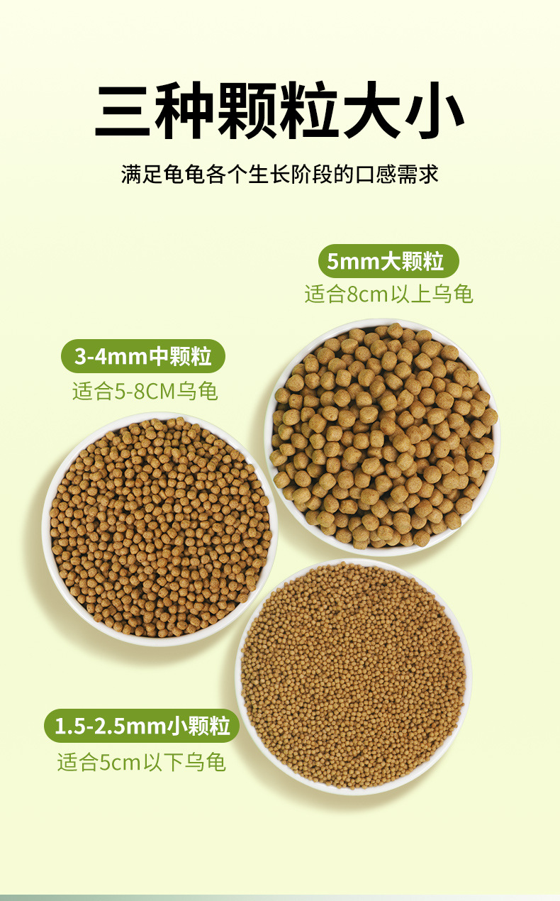 小粒 1.5~2.5mm/140g/450ml【ウシガメ専用・高カルシウム・高たんぱく】,中粒 3~4mm/130g/450ml【亀専用・高カルシウム・高たんぱく】,大粒5mm/120g/450ml【亀専用・高カルシウム・高たんぱく】