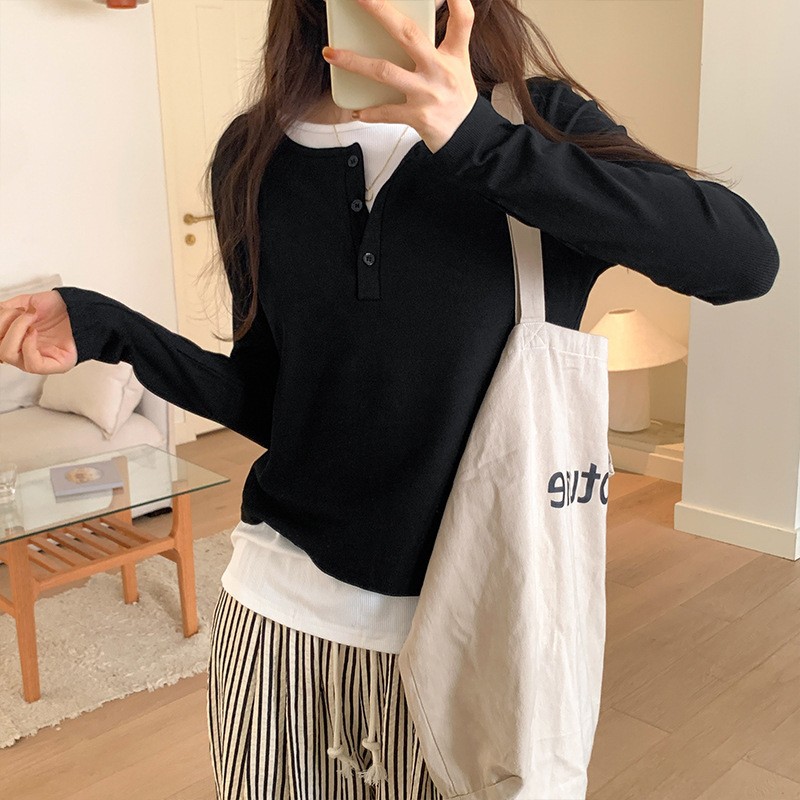 秋冬の偽の2つの長袖のtシャツは身を修めて中にねじの綿の底のシャツを掛けます。