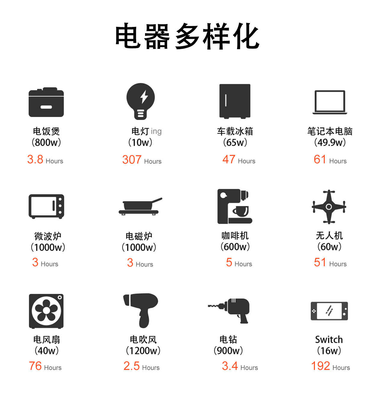 モデル番号 1200W-950Wh,3.3kW-3.3kWh,3kW-6kWh,6.2kW-6.6kWh,11kw-15kwh,2.4kW-3.8kWh,12kW-15kWh